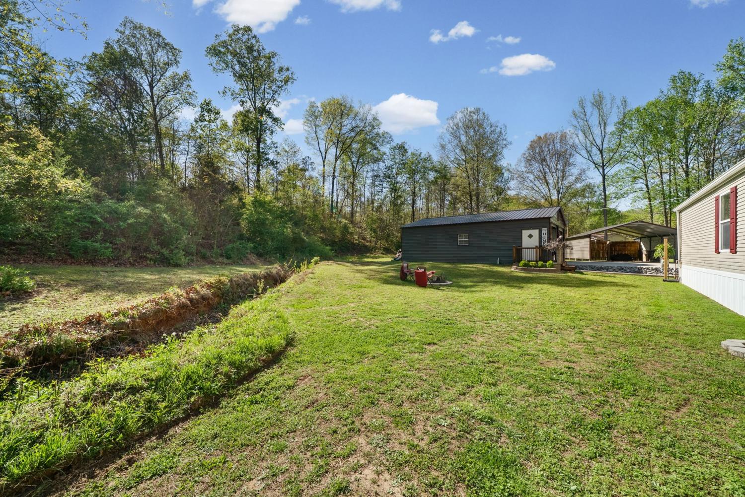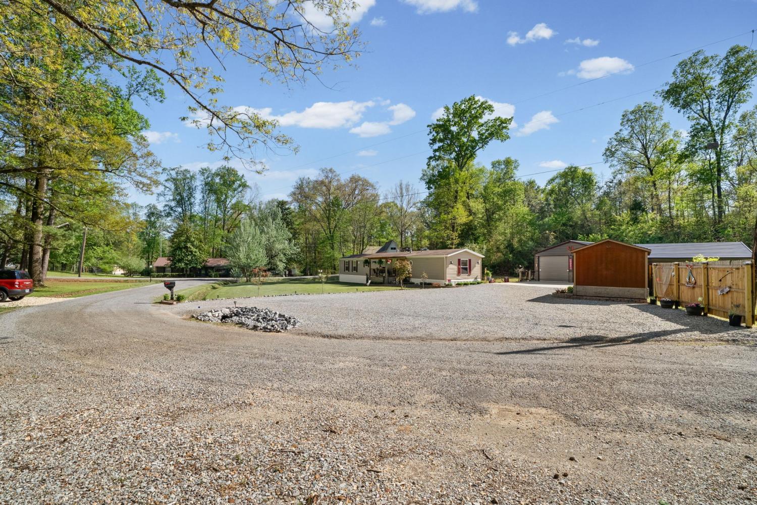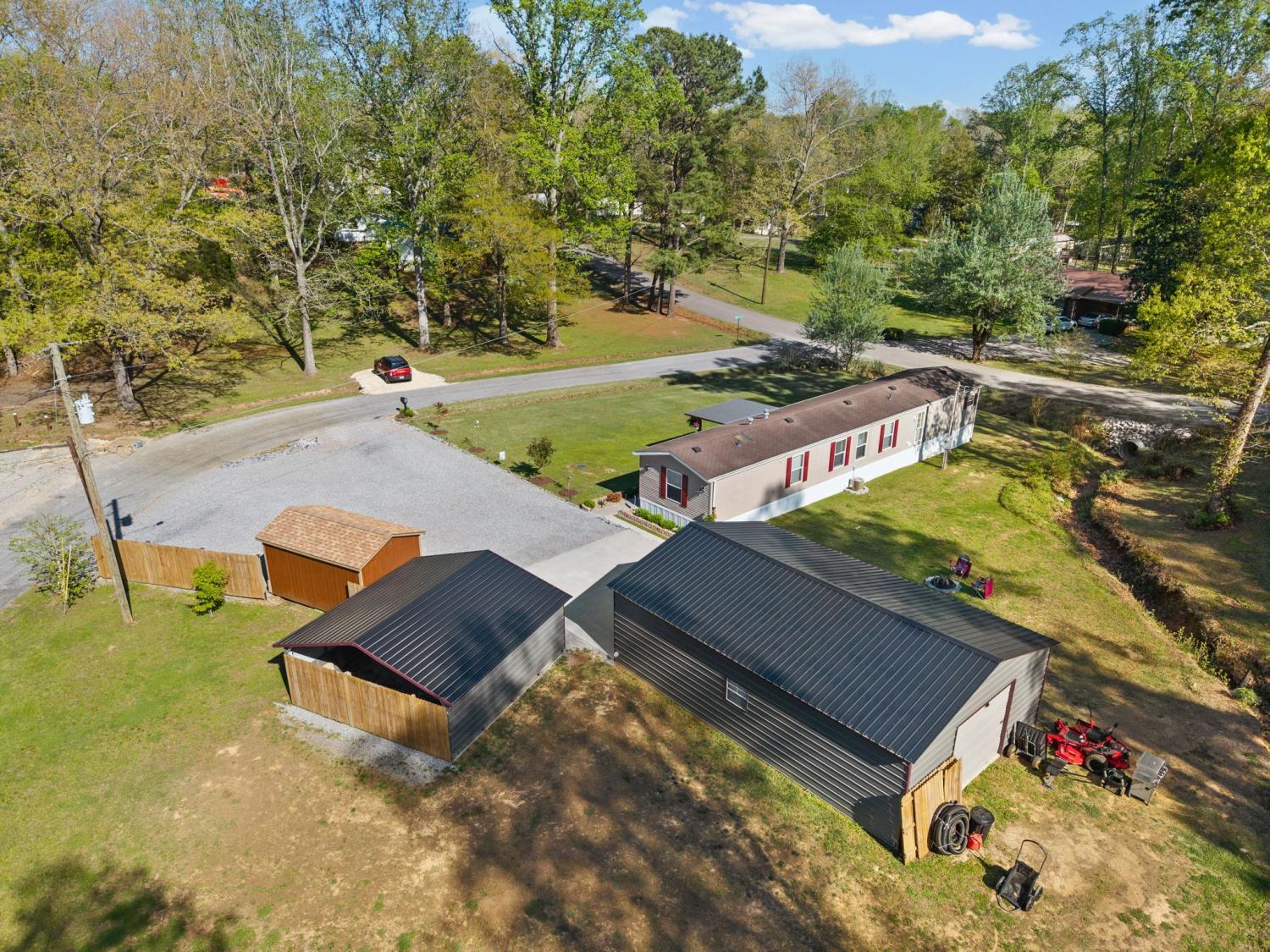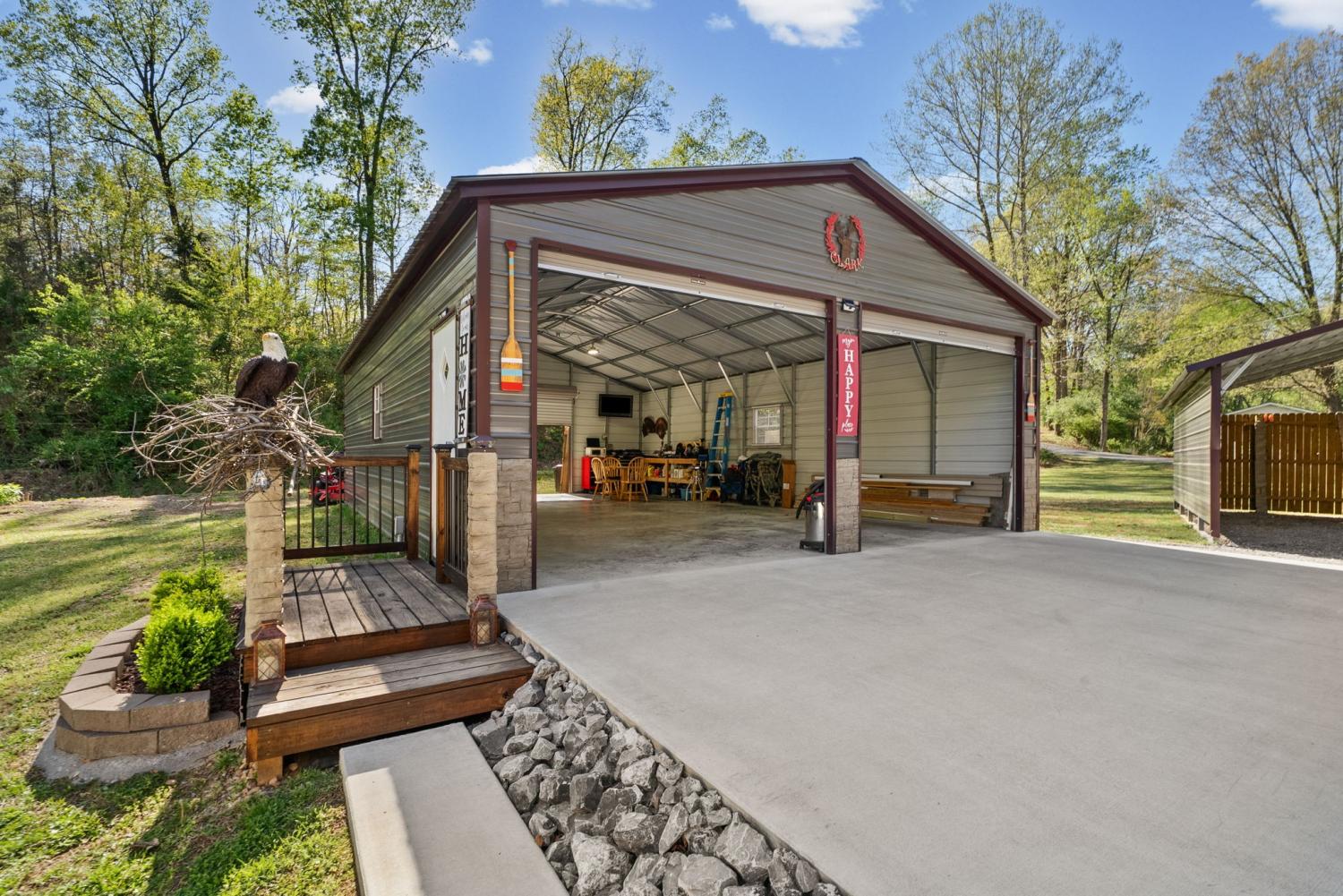 Bring your boat and park it in the large detached garage or dock it at the marina only 0.9 mile away! Beautiful Kentucky Lake-launching-marinas and golf course are right here for you. This gem is waiting for you and has been meticulously maintained. Find this renovated mobile home with 2x6 exterior walls, house style windows, vinyl siding and shingle roofing offering open floor plan with 3BR-2BA. You find LVP flooring, new interior paint, SS appliances along with washer and dryer to be included. Primary bedroom offers large closet space and primary bath with nice soaking tub and separate step in shower. Covered front deck with sidewalk leading to driveway and detached garage. Concrete parking pad found in the front area of the garage and over to the detached double carport. You have a small Amish built storage building/workshop which is wired and offers one side storage loft and work bench. The 24x36 metal detached garage with hi-beam LED lighting offers side entrance door, 2 front bays and one back bay door-all being electric roll ups. Front doors offer 10x10 space. The 24x24 detached metal carport has a gravel bottom with wind/storm anchors and privacy fence to the back side. You have ample parking space and side drive through area being so convenient. You find a 30AMP electric plug ideal for the RV/ camper parking and the level lot being ideal to support the family or friends. Convenient area to nearby shopping and multiple restaurants-dining being ideal for full time-seasonal or airBNB life style. This is a very inviting property and a must see to appreciate!