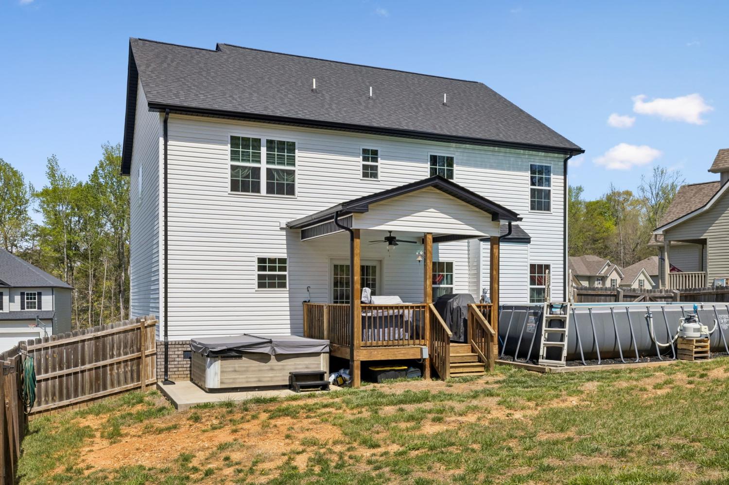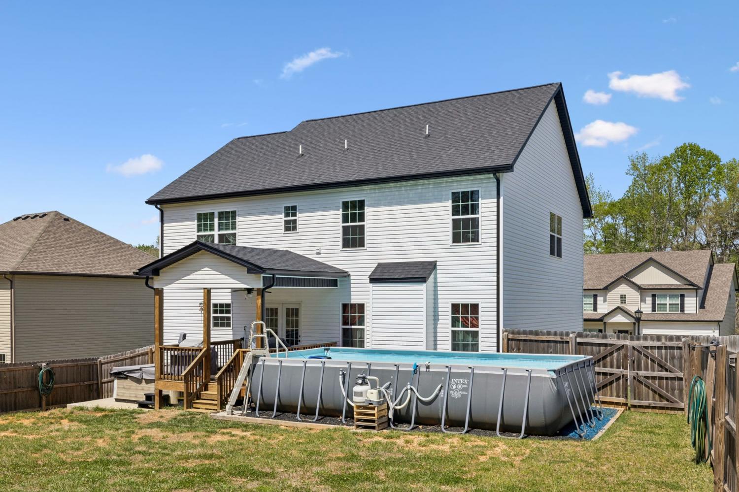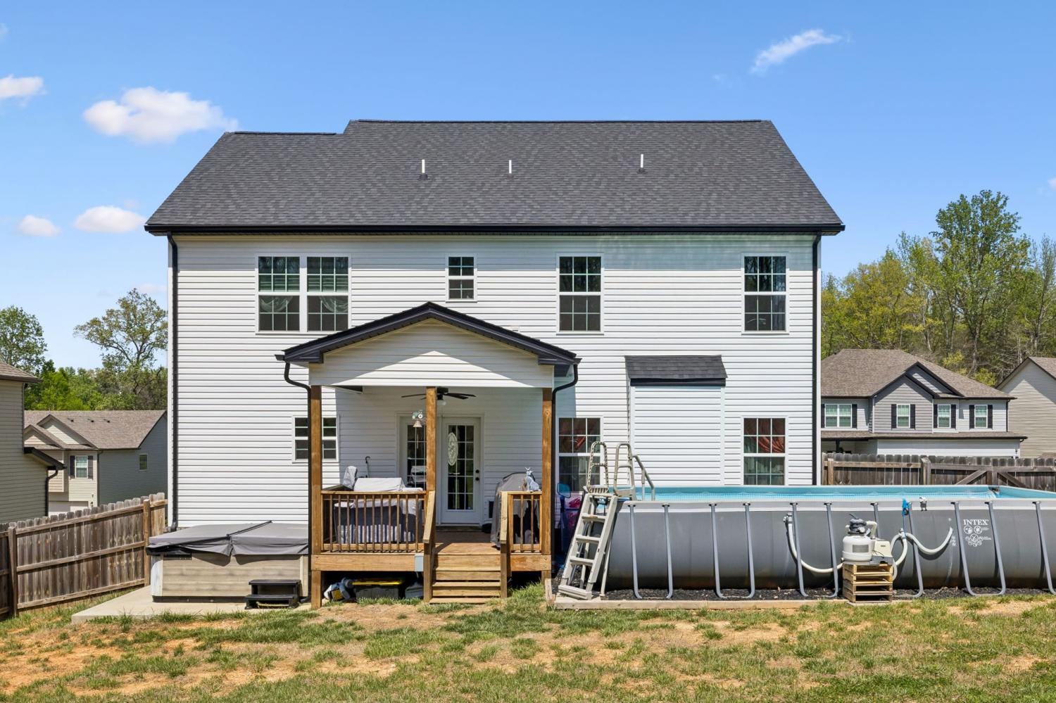 Welcome to 380 Barry Dr in the highly desirable Hampton Hills neighborhood of Clarksville! This spacious 4-bedroom, 2.5-bath home offers the perfect blend of comfort, functionality, and outdoor living on a large 0.42-acre lot. Step inside to an open floorplan designed for both everyday living and entertaining. The living room features a cozy fireplace, flowing seamlessly into the kitchen where a peninsula provides seating for three—perfect for casual meals or gathering with guests. Just off the main living space, you’ll find a versatile piano room that can easily serve as a formal dining room, home office, or flex space to fit your needs. Upstairs, the primary suite offers a relaxing retreat with a private bathroom complete with a separate tub and shower. Three additional bedrooms provide plenty of space for family, guests, or hobbies. Out back is where this home truly shines—enjoy your own private oasis with a covered deck overlooking the above-ground pool and hot tub, all surrounded by a privacy fence. With no neighbors directly behind you and a peaceful tree line backdrop, you’ll love the added sense of privacy and space. Additional features include a 2-car attached garage with separate stalls and a layout that balances comfort and convenience. Located in sought-after Hampton Hills, this home is one you won’t want to miss!