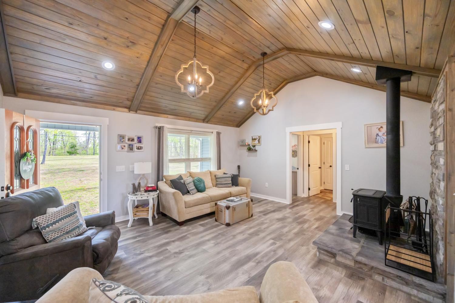 13.34 Wooded Acres • Comfortable Living • Exceptional Shop • Prime Location! Enjoy the best of both worlds at 1395 Bible Hill Rd in Parsons, TN—peaceful, private country living on 13.34 wooded acres, yet conveniently located just over a mile from the heart of Parsons with easy access to shopping, post office, banks, schools, & churches. This inviting home is designed for comfortable everyday living, featuring a warm & welcoming living room with a stunning 12-foot tongue & groove barreled ceiling & a beautiful stone hearth with wood-burning stove—perfect for cozy evenings. Mohawk luxury vinyl flooring runs throughout, offering durability & low-maintenance ease. The kitchen & dining area are open & functional, complete with abundant cabinetry, double lazy Susans, stainless farmhouse sink with peaceful countryside views, all appliances, under-cabinet lighting, & a cleverly tucked-away laundry area behind a custom barn door with added storage. The split-bedroom layout enhances privacy, with a spacious master suite offering a large walk-in closet & double vanity bath, while two additional bedrooms & a full bath are situated on the opposite side—ideal for family or guests. Step outside to a relaxing back deck overlooking your private, wooded acreage—perfect for unwinding, entertaining, or watching kids & pets enjoy the outdoors. For those who need space to work, create, or enjoy hobbies, the standout feature is the impressive detached garage/workshop—heated, cooled, insulated, & finished w/wood plank walls, plus soaring 14.5-foot ceilings. An attached lean-to adds even more room for equipment, mowers, or recreational vehicles. Love the outdoors? You’re just minutes from the beautiful Tennessee River, offering endless opportunities for boating, fishing, floating, & water recreation. With 13.34 acres of wooded privacy, a comfortable & well-designed home, a top-notch shop space, & a location just minutes from town —this property delivers a balance of privacy & convenience!