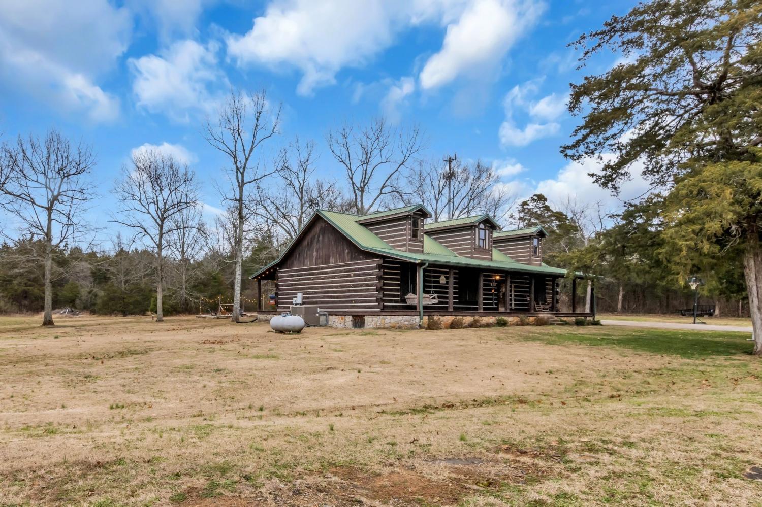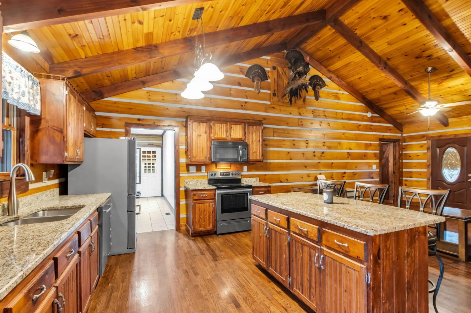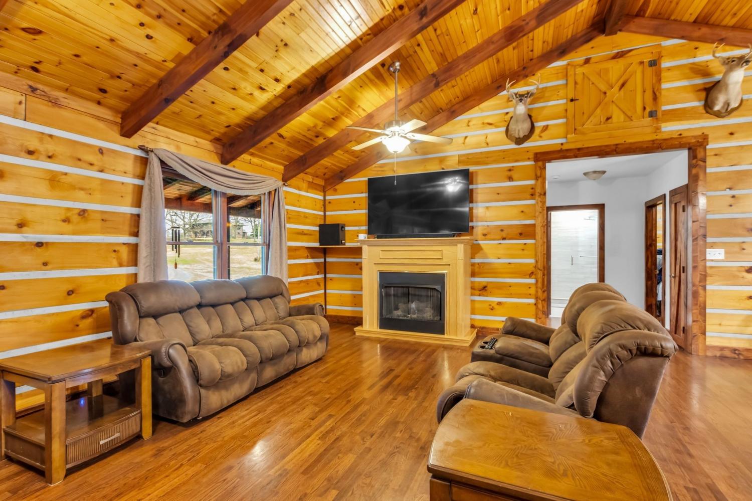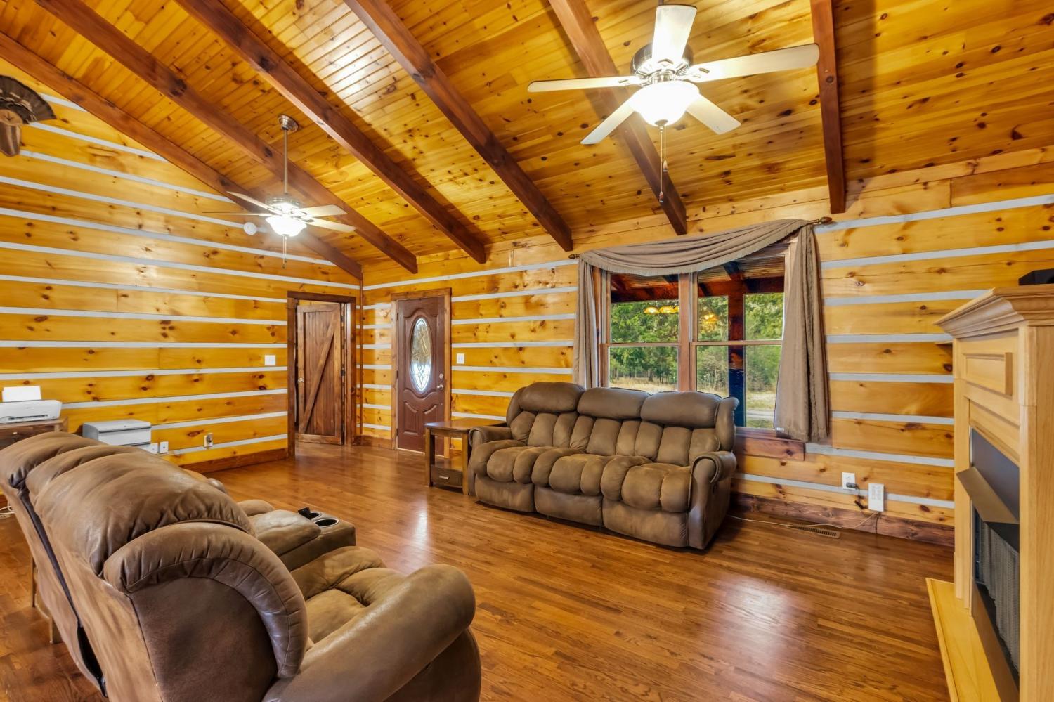 Welcome home to peaceful country living in this beautifully maintained log home. Nestled on 5 spacious acres, the property features expansive covered front and back porches stretching the length of the home—perfect for relaxing and enjoying the serene surroundings. Inside, the open-concept design showcases vaulted ceilings, stunning wood floors, and timeless rustic charm. The kitchen offers custom detailed cabinetry, granite countertops, an eat-in dining area, and additional seating at the island—ideal for everyday living and entertaining. The main suite features a large walk-in closet and a private bath with gorgeous tile flooring, double vanities, and a walk-in shower. Two additional bedrooms and a full bath provide comfortable space for family or guests.