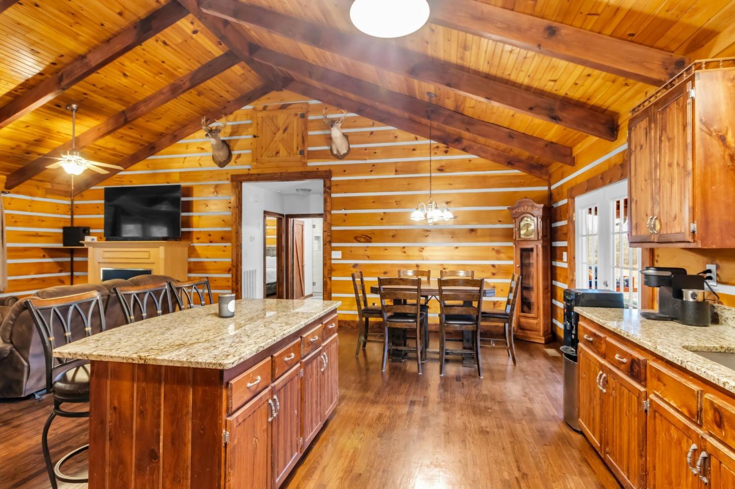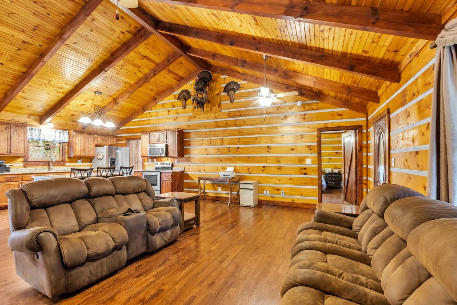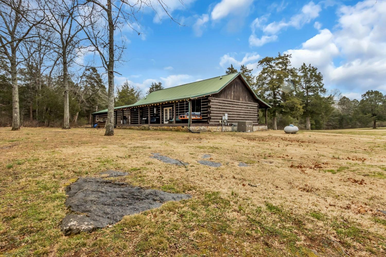 Welcome home to peaceful country living in this beautifully maintained log home. Nestled on 5 spacious acres, the property features expansive covered front and back porches stretching the length of the home—perfect for relaxing and enjoying the serene surroundings. Inside, the open-concept design showcases vaulted ceilings, stunning wood floors, and timeless rustic charm. The kitchen offers custom detailed cabinetry, granite countertops, an eat-in dining area, and additional seating at the island—ideal for everyday living and entertaining. The main suite features a large walk-in closet and a private bath with gorgeous tile flooring, double vanities, and a walk-in shower. Two additional bedrooms and a full bath provide comfortable space for family or guests.