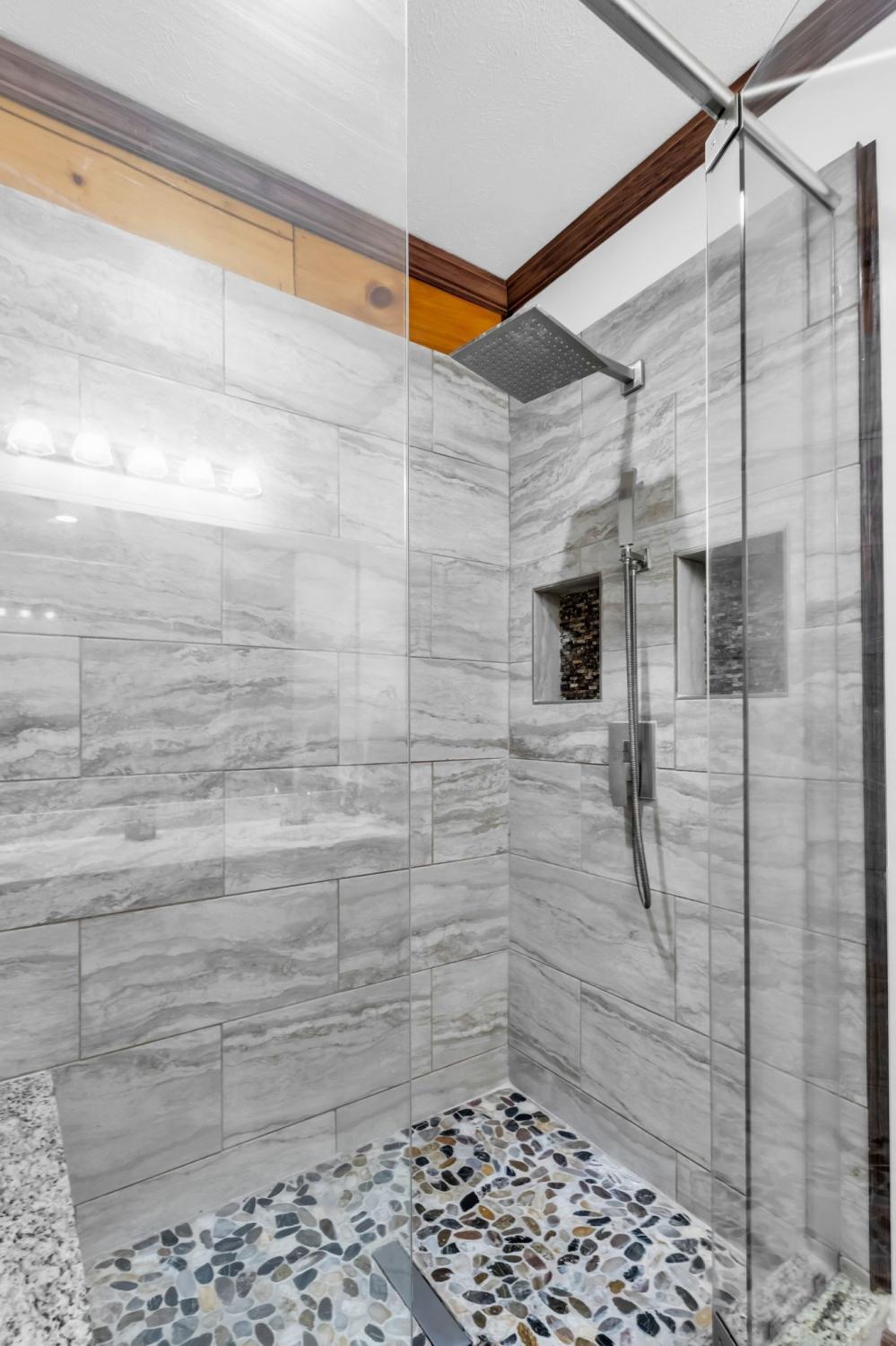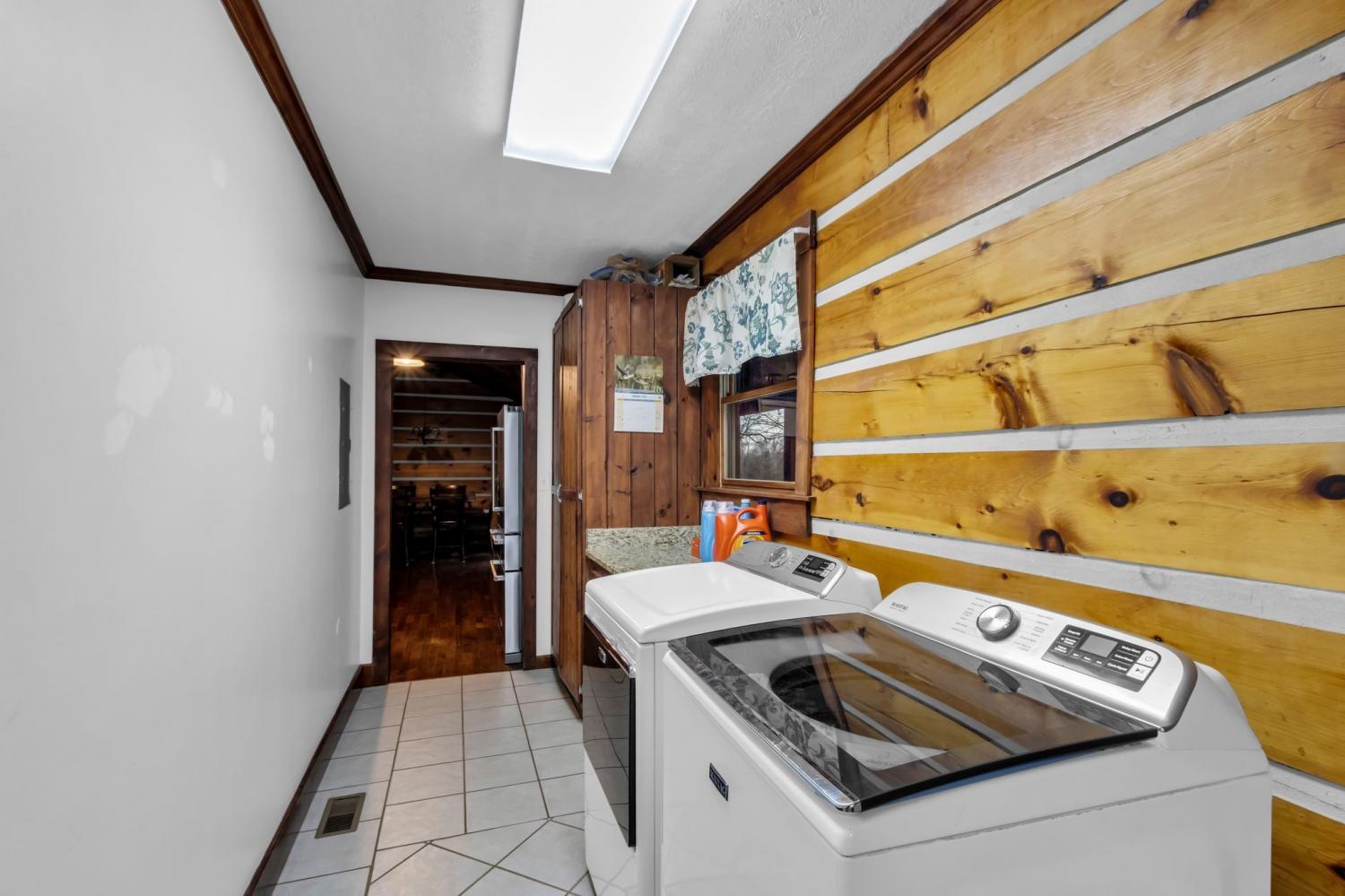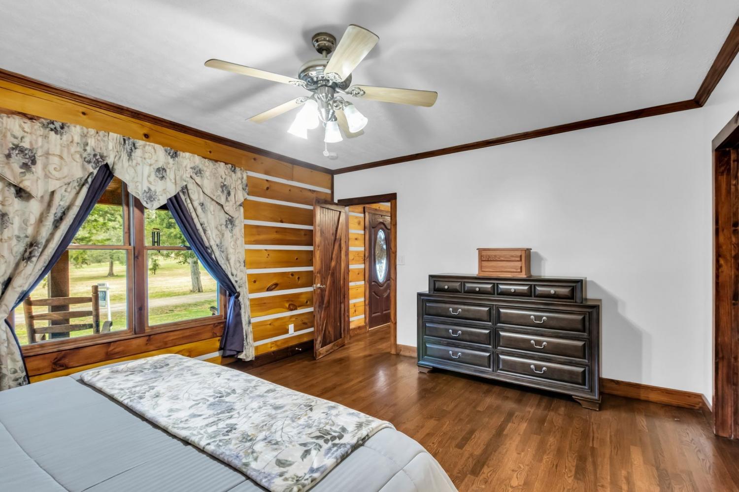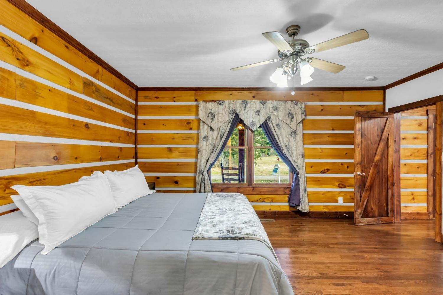 Welcome home to peaceful country living in this beautifully maintained log home. Nestled on 5 spacious acres, the property features expansive covered front and back porches stretching the length of the home—perfect for relaxing and enjoying the serene surroundings. Inside, the open-concept design showcases vaulted ceilings, stunning wood floors, and timeless rustic charm. The kitchen offers custom detailed cabinetry, granite countertops, an eat-in dining area, and additional seating at the island—ideal for everyday living and entertaining. The main suite features a large walk-in closet and a private bath with gorgeous tile flooring, double vanities, and a walk-in shower. Two additional bedrooms and a full bath provide comfortable space for family or guests.