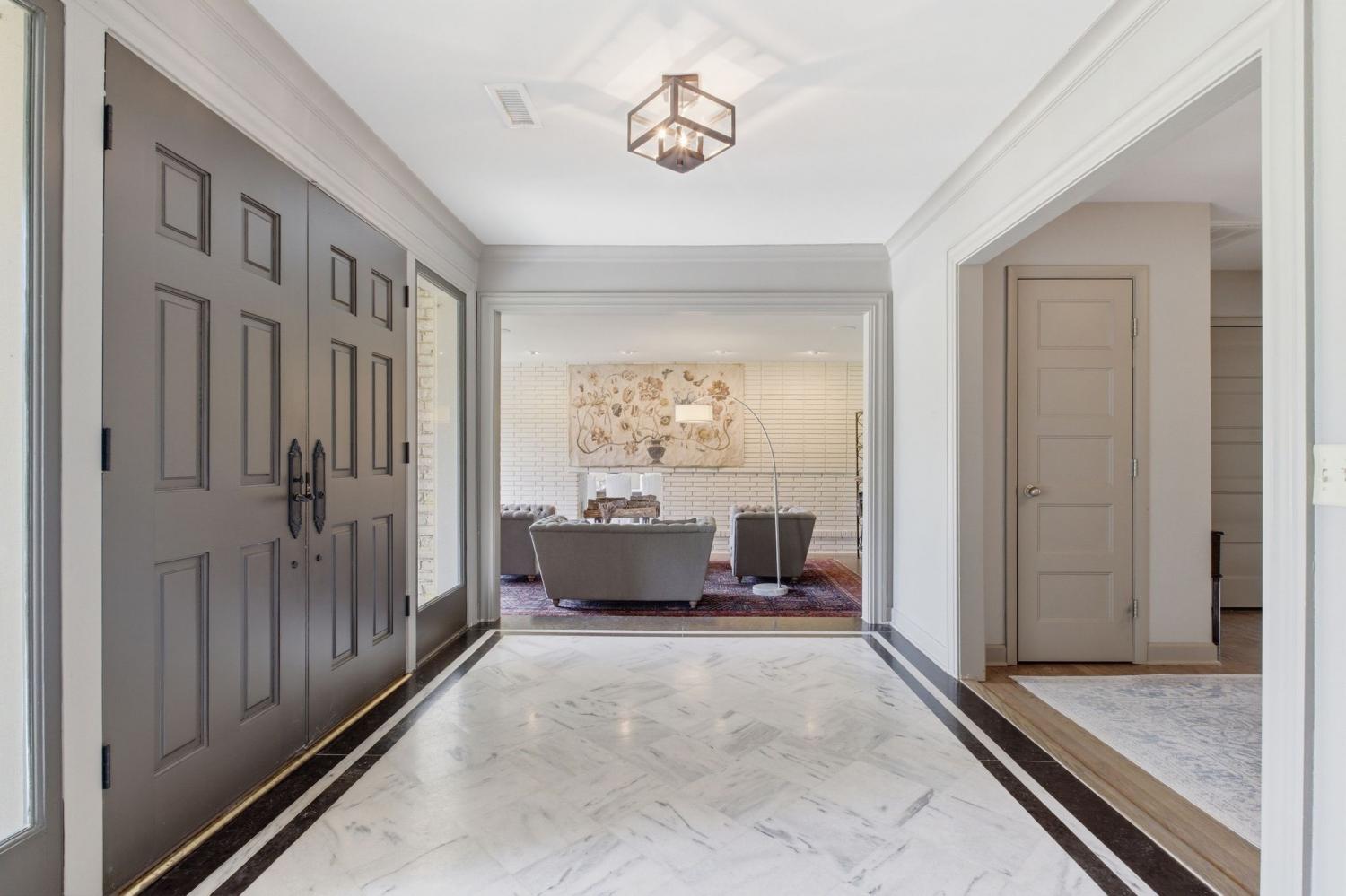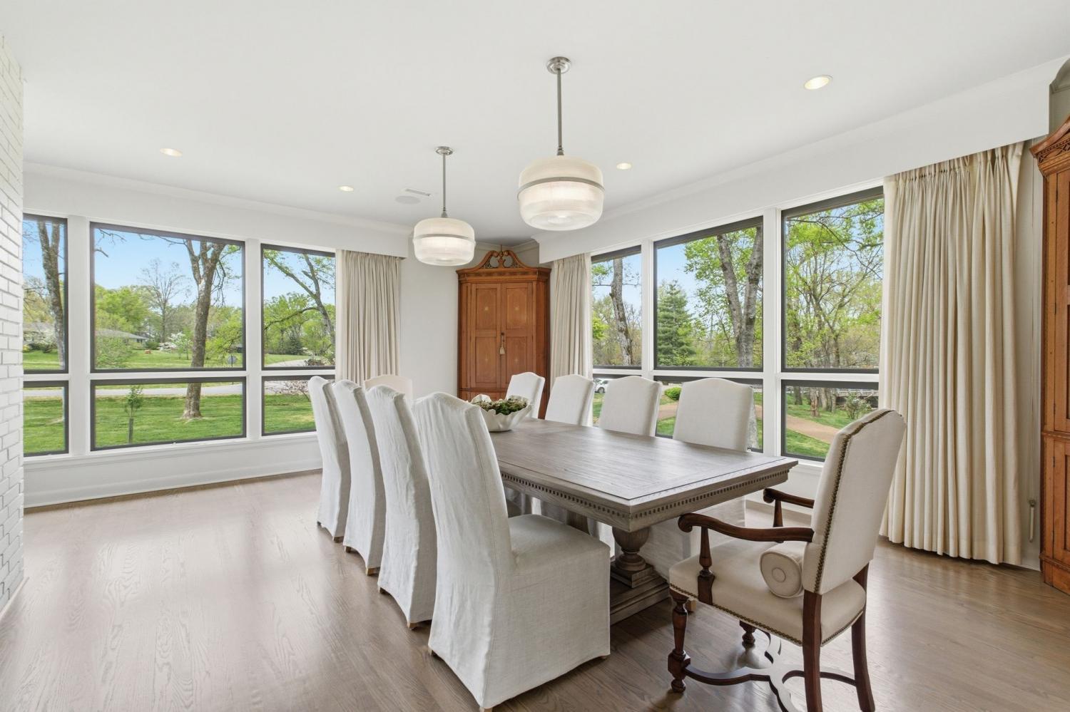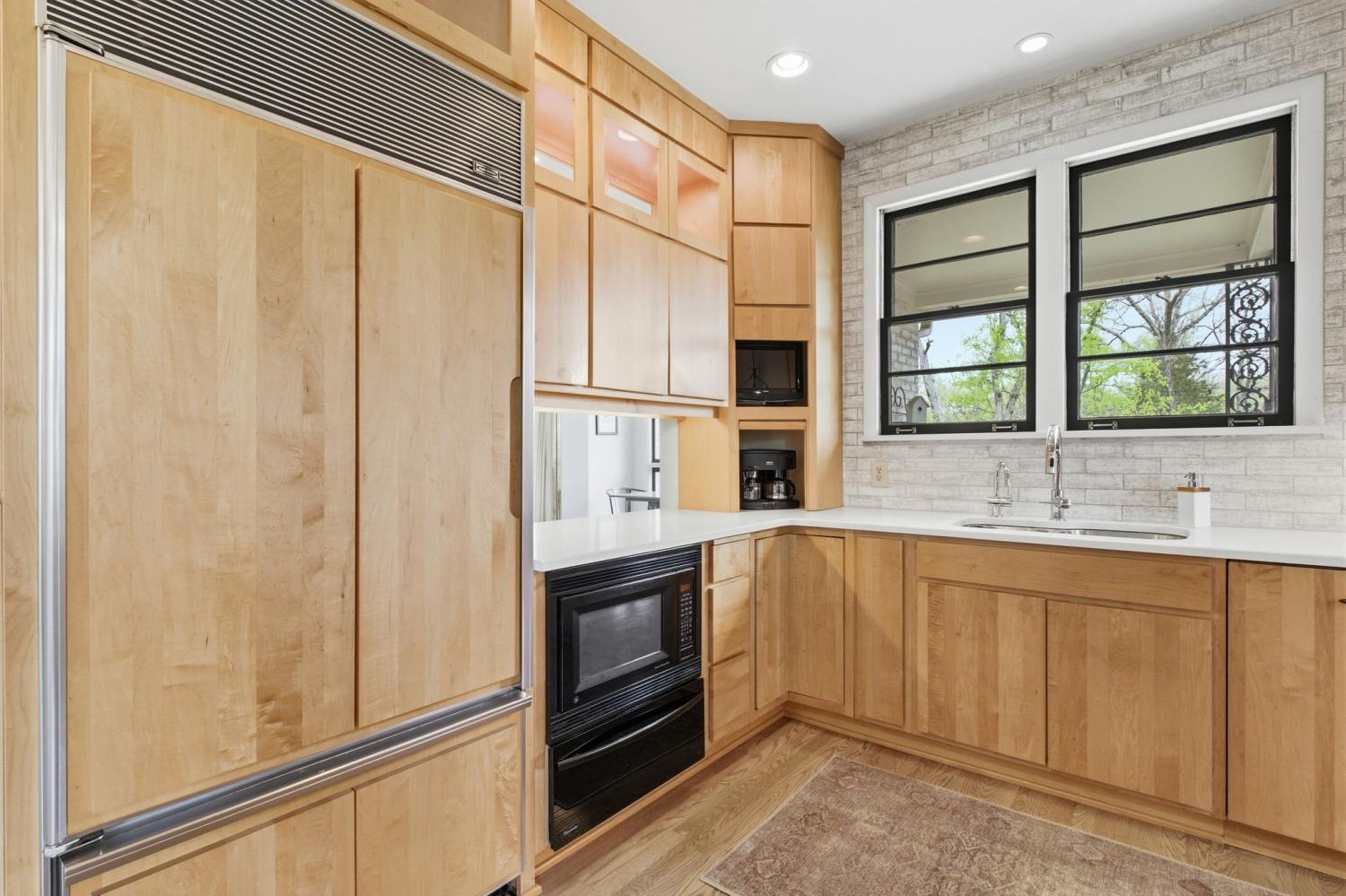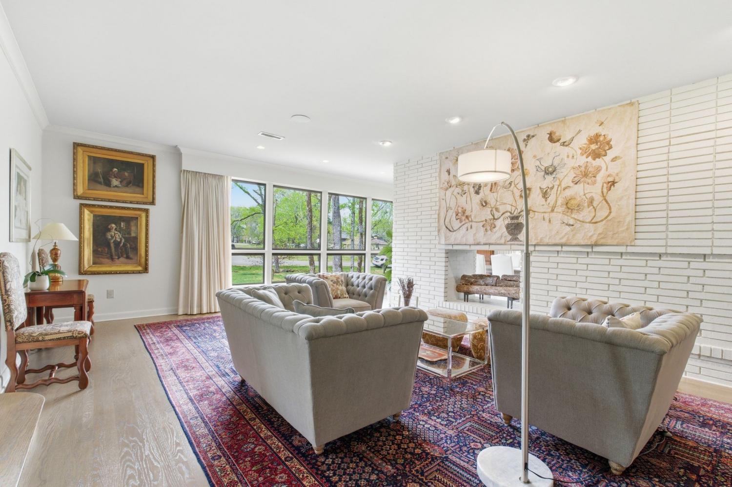 This exceptional mid-century residence is a rare offering, set on a private, park-like lot. Designed for effortless one-level living, the home is filled with natural light and showcases serene views from every window. Thoughtfully renovated in 2016, the current owners preserved its timeless mid-century character while seamlessly integrating modern updates. The kitchen is both upgraded and functional, featuring premium appliances including a Viking six-burner gas range, double ovens, a Sub-Zero refrigerator, walk-in pantry, and a wet bar. The open-concept kitchen and main living space offer the popular style of living, while an additional separate living area provides flexibility—as a den, or potential fourth bedroom with ensuite bath. The primary suite is move-in ready, featuring a beautifully updated bathroom. An elevator provides convenient access to the garage, which offers abundant storage in the unfinished basement. The outdoor living is lovely with thoughtfully designed spaces that invite both relaxation and entertaining. Enjoy a fireplace, outdoor gas grill, fire pit, bocce ball court, and multiple patio areas—all surrounded by mature landscaping that ensures privacy. A circular driveway adds both convenience and ample parking. Meticulously maintained, the home includes numerous upgrades such as a Sonos sound system, encapsulated attic with foam insulation, and new garage doors with updated systems. Opportunities like this are rare—the chance to own a true mid-century, single-level home on a flat lot, tucked away in a premier location.
