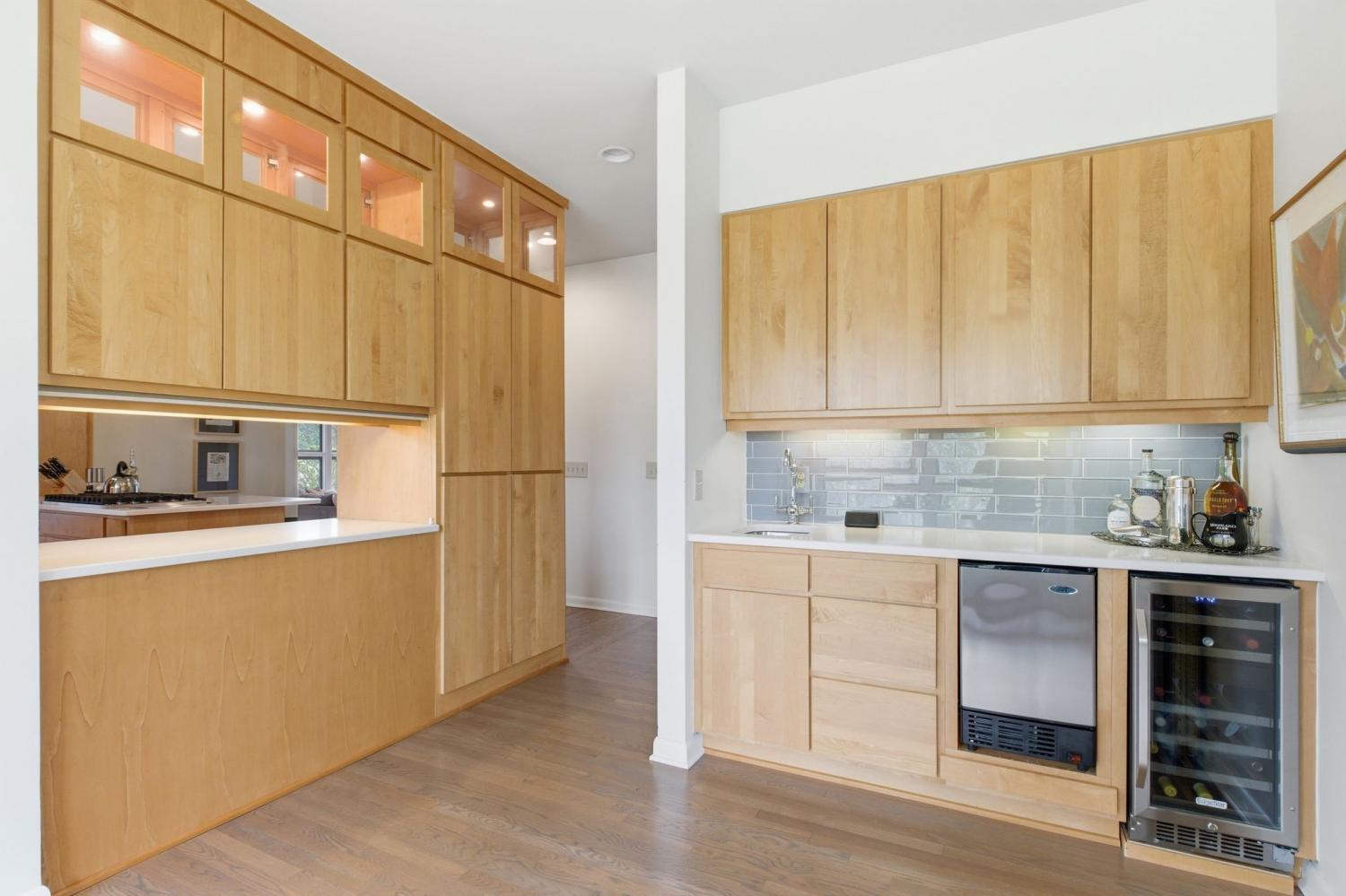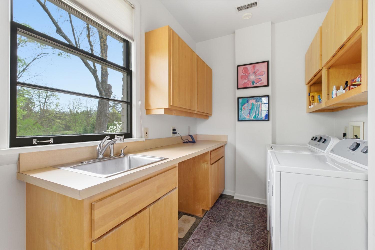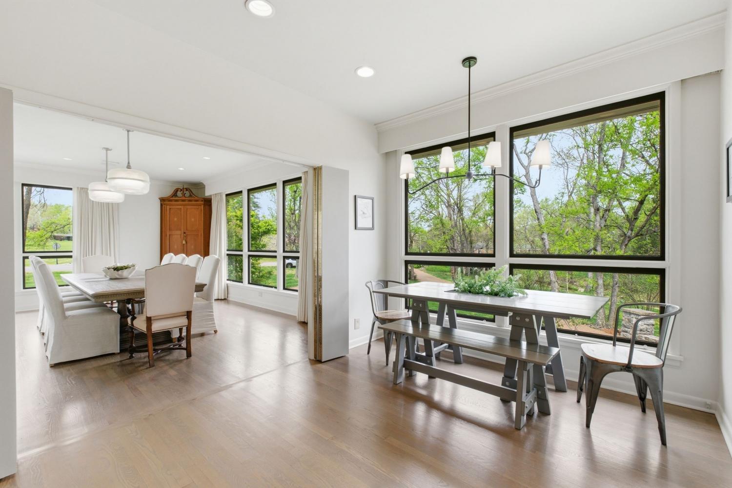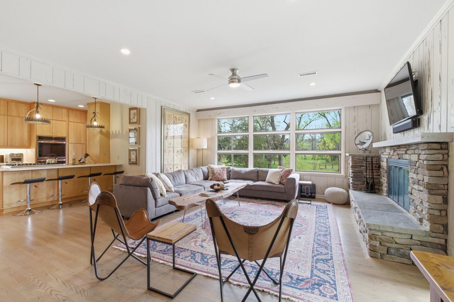 This exceptional mid-century residence is a rare offering, set on a private, park-like lot. Designed for effortless one-level living, the home is filled with natural light and showcases serene views from every window. Thoughtfully renovated in 2016, the current owners preserved its timeless mid-century character while seamlessly integrating modern updates. The kitchen is both upgraded and functional, featuring premium appliances including a Viking six-burner gas range, double ovens, a Sub-Zero refrigerator, walk-in pantry, and a wet bar. The open-concept kitchen and main living space offer the popular style of living, while an additional separate living area provides flexibility—as a den, or potential fourth bedroom with ensuite bath. The primary suite is move-in ready, featuring a beautifully updated bathroom. An elevator provides convenient access to the garage, which offers abundant storage in the unfinished basement. The outdoor living is lovely with thoughtfully designed spaces that invite both relaxation and entertaining. Enjoy a fireplace, outdoor gas grill, fire pit, bocce ball court, and multiple patio areas—all surrounded by mature landscaping that ensures privacy. A circular driveway adds both convenience and ample parking. Meticulously maintained, the home includes numerous upgrades such as a Sonos sound system, encapsulated attic with foam insulation, and new garage doors with updated systems. Opportunities like this are rare—the chance to own a true mid-century, single-level home on a flat lot, tucked away in a premier location.