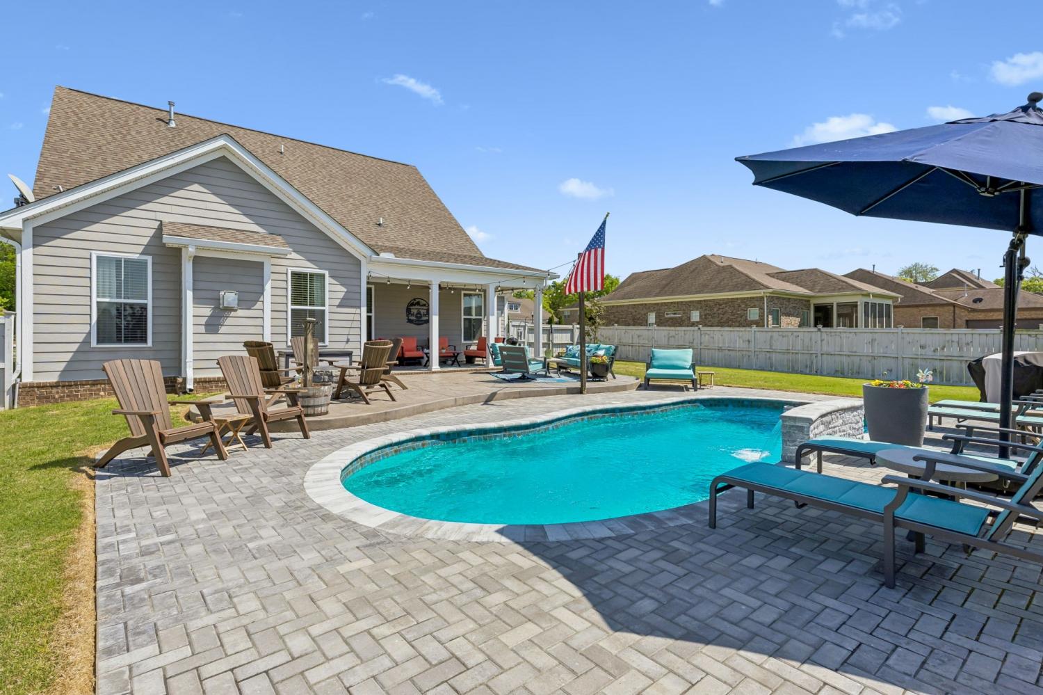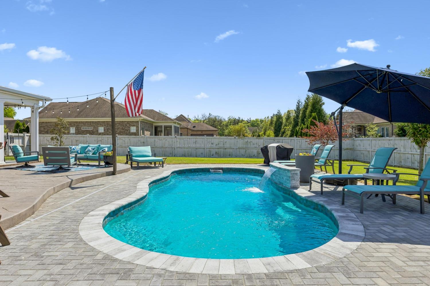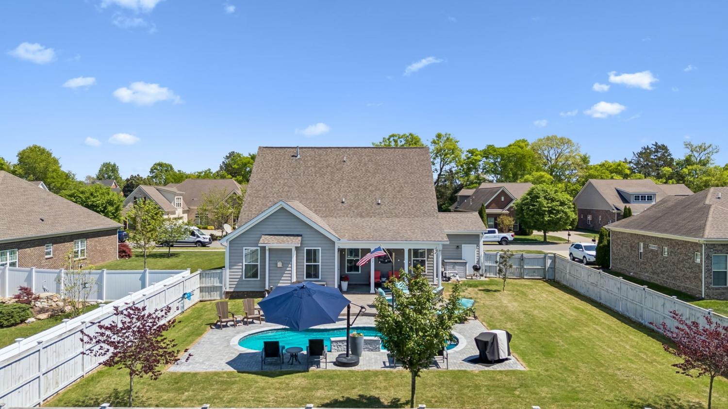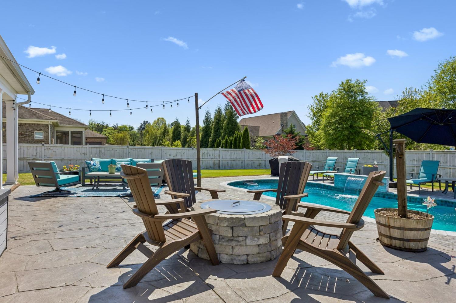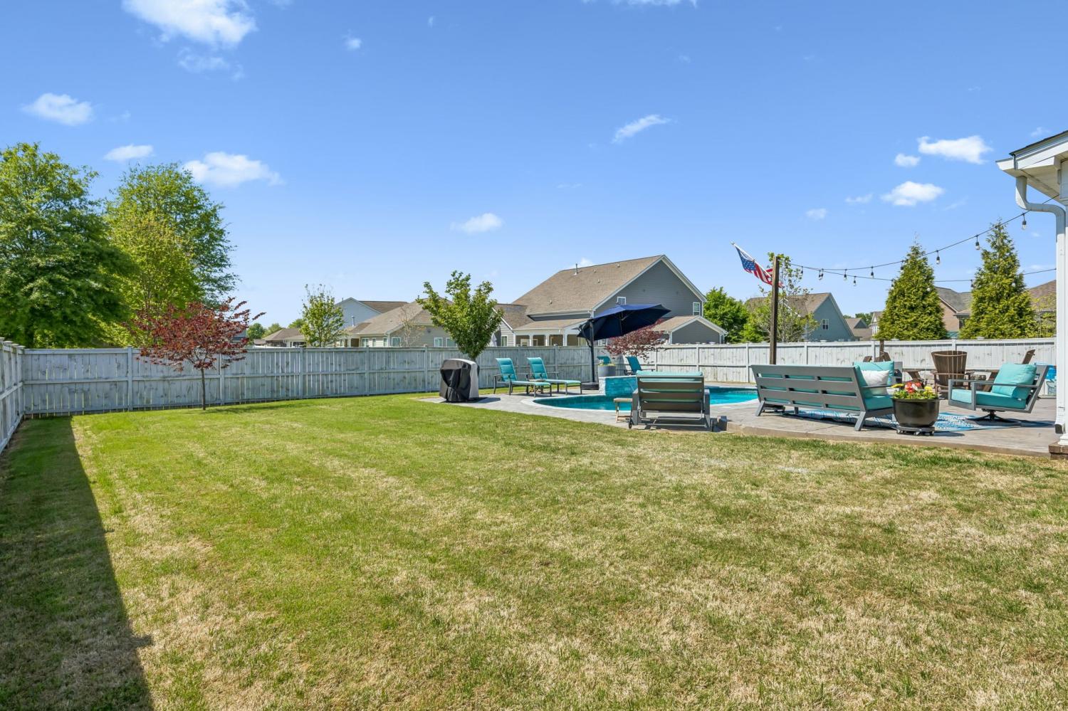 This beautifully maintained home offers the perfect blend of functional layout and standout features, highlighted by a private backyard retreat with an in-ground pool and expansive patio—ideal for entertaining or relaxing all season long. Inside, the main level features all solid surface flooring and an open-concept design that seamlessly connects the kitchen, dining, and living areas. The kitchen is a true centerpiece with a large island, quartz countertops, stainless steel appliances, subway tile backsplash, and statement pendant lighting, all overlooking the inviting living room with a fireplace and custom beam ceiling detail. A separate formal dining room provides additional space for hosting, while the powder bath adds a touch of style with upgraded finishes. The primary suite is conveniently located on the main level, offering privacy and comfort with a well-appointed en-suite bath featuring dual vanities, a tiled shower, and clean, modern finishes. Upstairs, you’ll find two additional bedrooms, a full bath, and a spacious second living area—perfect for a bonus room, media space, or home office. Thoughtful details throughout the home include accent walls, upgraded lighting, water softener system, and a welcoming covered front porch and upper balcony that add to the home’s charm and curb appeal. This one checks all the boxes with flexible living space, quality finishes, walk out attic storage, and a backyard designed to be enjoyed!
