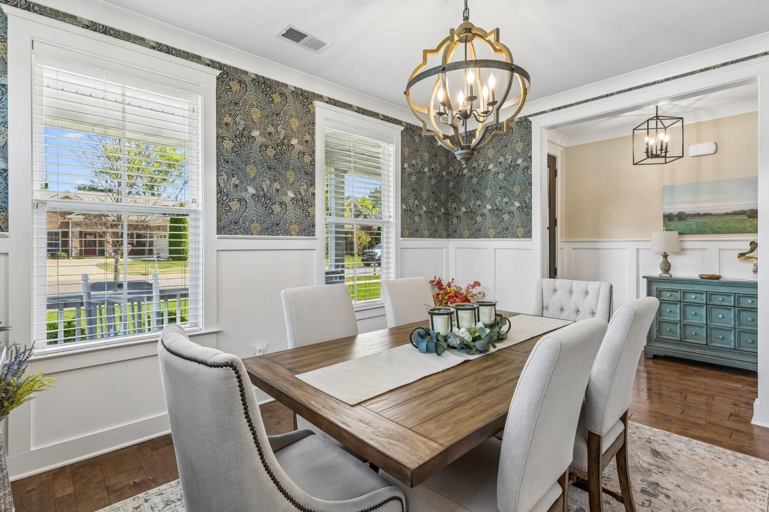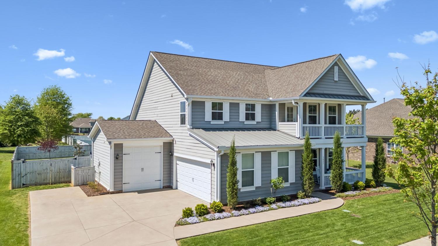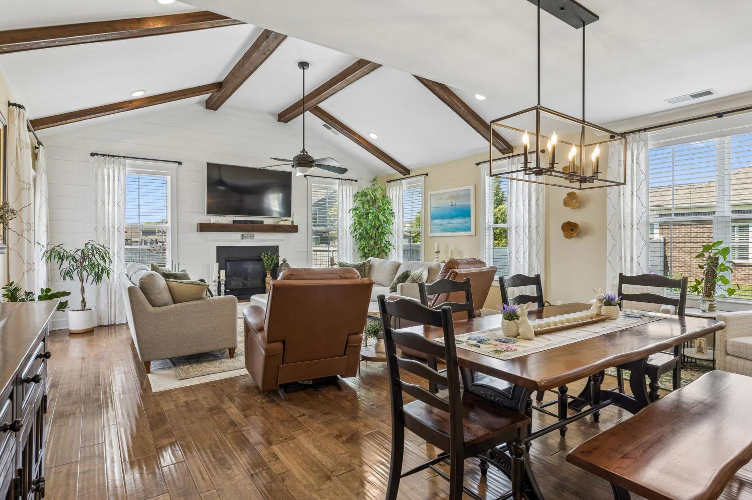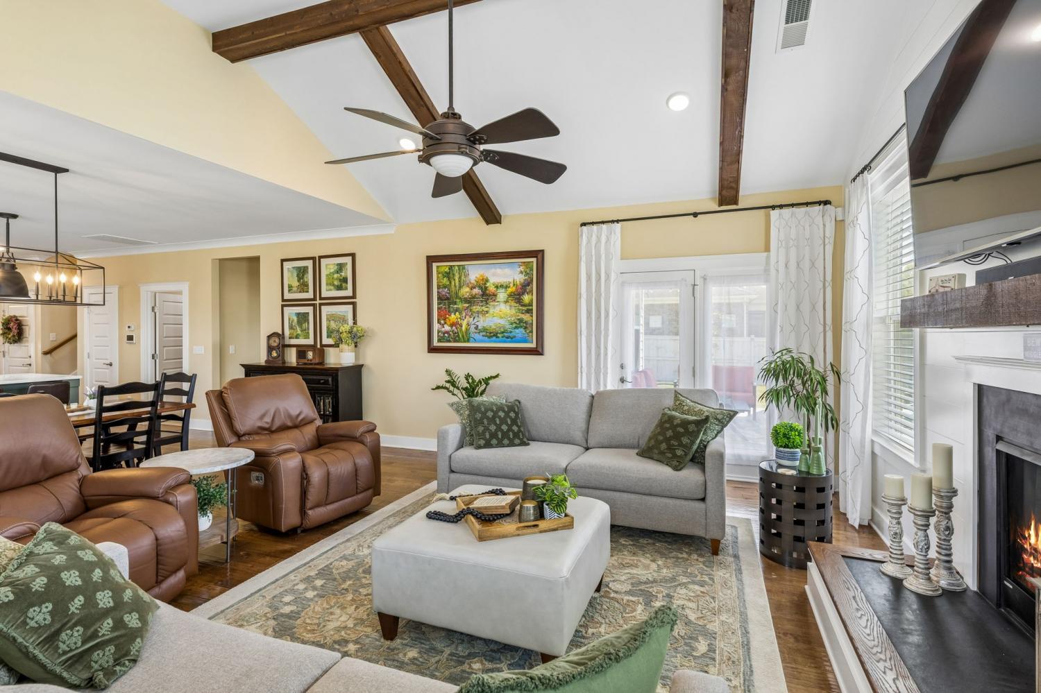 This beautifully maintained home offers the perfect blend of functional layout and standout features, highlighted by a private backyard retreat with an in-ground pool and expansive patio—ideal for entertaining or relaxing all season long. Inside, the main level features all solid surface flooring and an open-concept design that seamlessly connects the kitchen, dining, and living areas. The kitchen is a true centerpiece with a large island, quartz countertops, stainless steel appliances, subway tile backsplash, and statement pendant lighting, all overlooking the inviting living room with a fireplace and custom beam ceiling detail. A separate formal dining room provides additional space for hosting, while the powder bath adds a touch of style with upgraded finishes. The primary suite is conveniently located on the main level, offering privacy and comfort with a well-appointed en-suite bath featuring dual vanities, a tiled shower, and clean, modern finishes. Upstairs, you’ll find two additional bedrooms, a full bath, and a spacious second living area—perfect for a bonus room, media space, or home office. Thoughtful details throughout the home include accent walls, upgraded lighting, water softener system, and a welcoming covered front porch and upper balcony that add to the home’s charm and curb appeal. This one checks all the boxes with flexible living space, quality finishes, walk out attic storage, and a backyard designed to be enjoyed!
