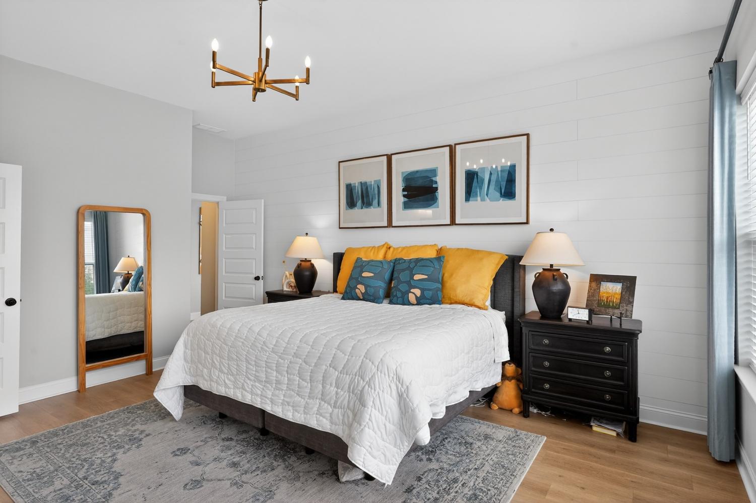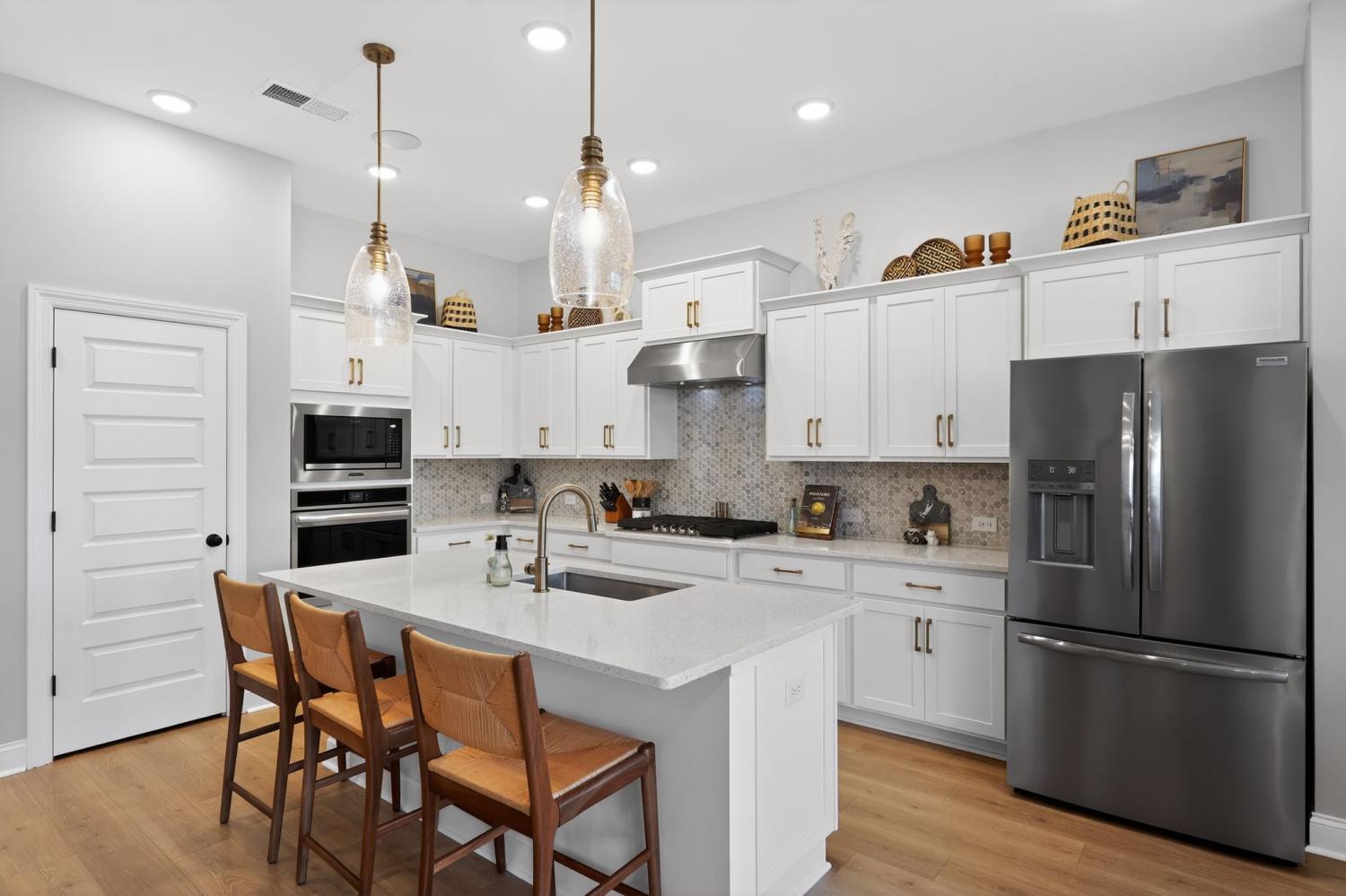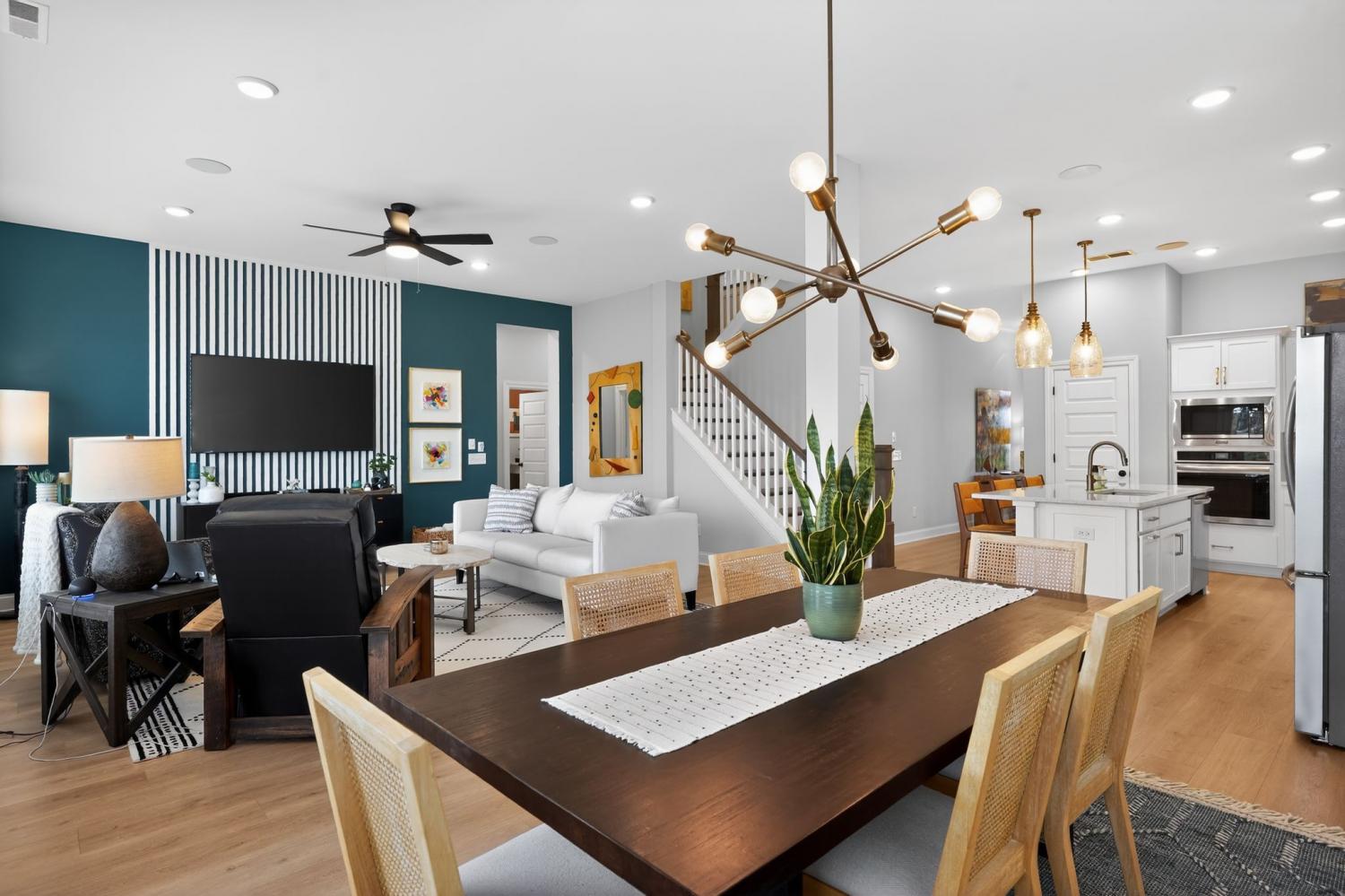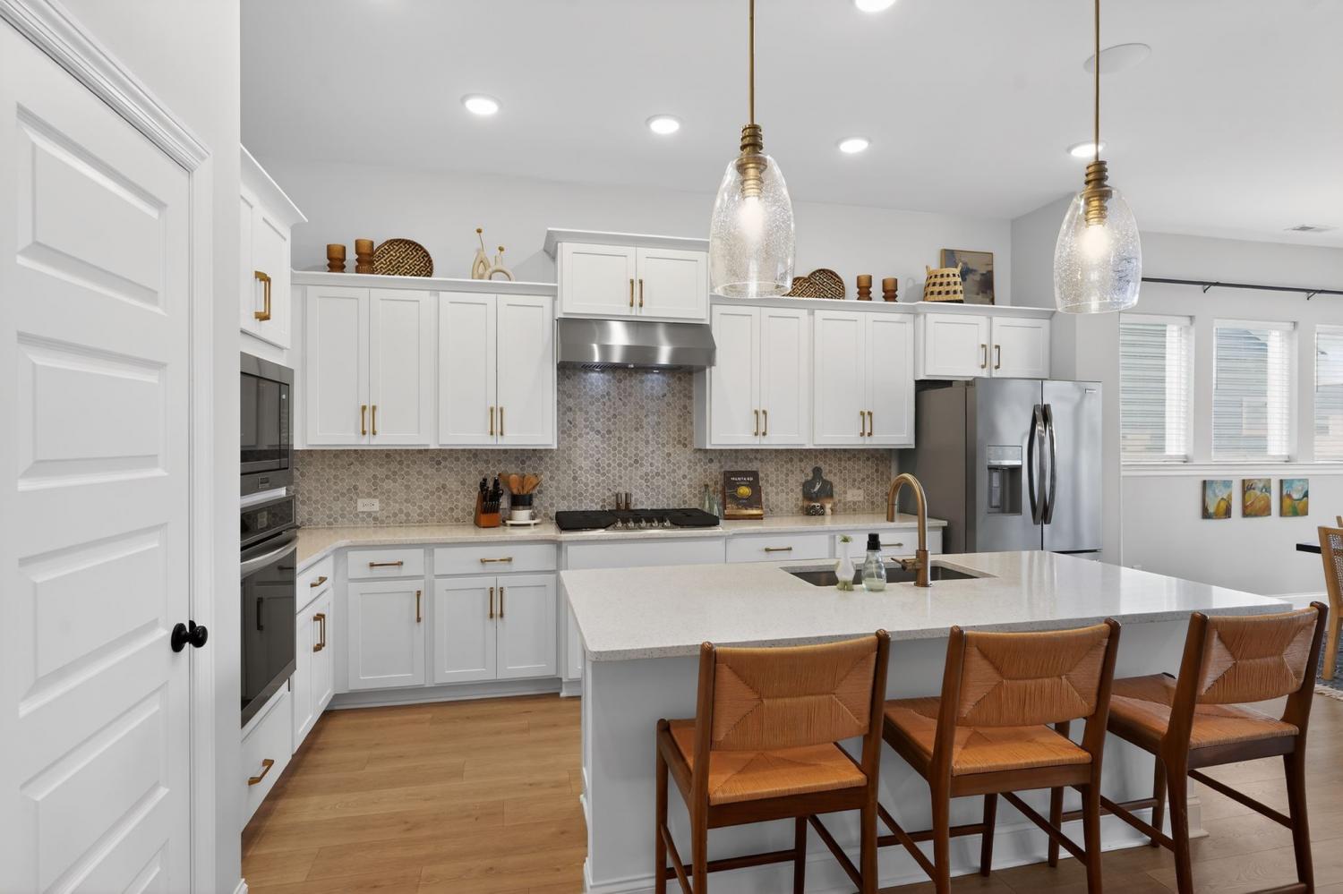 Welcome to the model home that truly has it all. Built in 2023 and lived in for only one year, this stunning 4 bed, 3 bath home offering 2,926 sqft is packed with designer finishes, custom upgrades, and magazine-worthy details throughout. From the moment you step inside, you’re welcomed by a stylish, cozy reading nook before the home opens into an impressive open-concept living space filled with natural light. The bright white chef’s kitchen is the showstopper, featuring gold accents, gas cooktop, built-in oven and microwave, oversized center island, two pantries (including a walk-in), and light oak flooring that flows throughout the main living areas. The kitchen opens seamlessly into the dining space highlighted by a statement gold chandelier and into the great room where a dramatic floor-to-ceiling vertical wood slat accent wall creates an unforgettable focal point. The primary suite on the main floor feels like a private retreat with wall-to-wall windows, a designer accent wall, and elegant chandelier. The spa-inspired bathroom showcases a massive walk-in shower with bench, floor-to-ceiling Moroccan star tile, marble accent wall, penny mosaic tile flooring, double vanity with gold fixtures, linen closet, and private water closet. The custom walk-in closet with built-ins connects directly to the laundry room for everyday convenience. Additional upgrades include custom closet systems throughout, a drop-zone with cubbies off the garage, guest bath with modern black tile and gold accents, epoxy garage flooring with extra storage, and a whole-home generator for peace of mind. Upstairs offers a spacious bonus room plus two additional bedrooms and a full bath with double vanity. Enjoy peaceful mornings on the covered back patio overlooking a level, tree-lined yard or relax on the charming covered front porch swing. Community amenities include a pool and park, offering the perfect blend of luxury, comfort, and lifestyle.