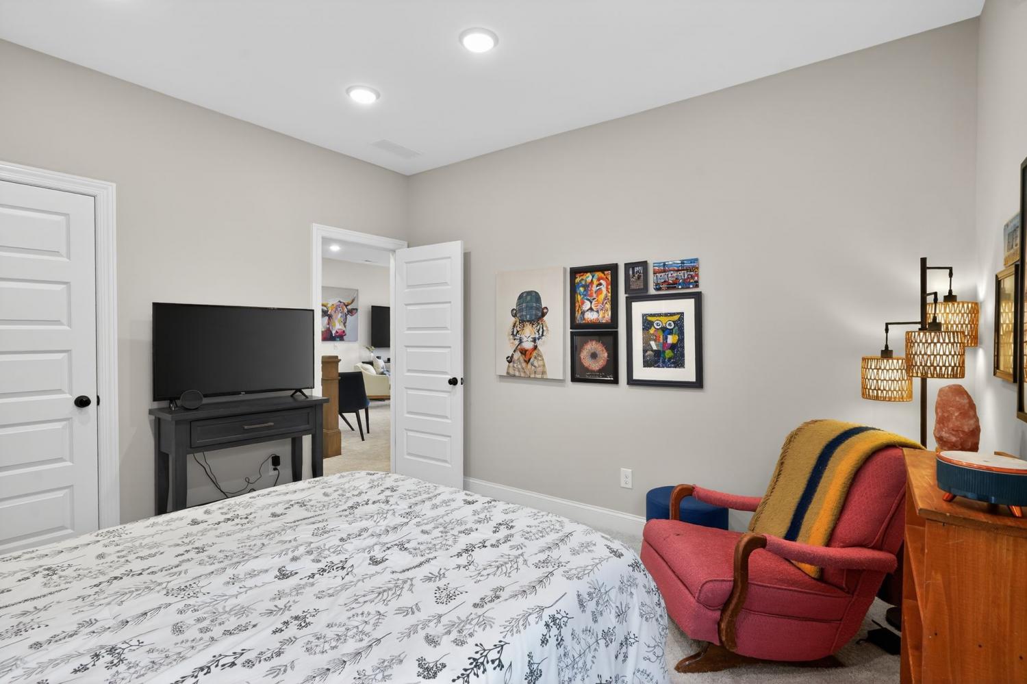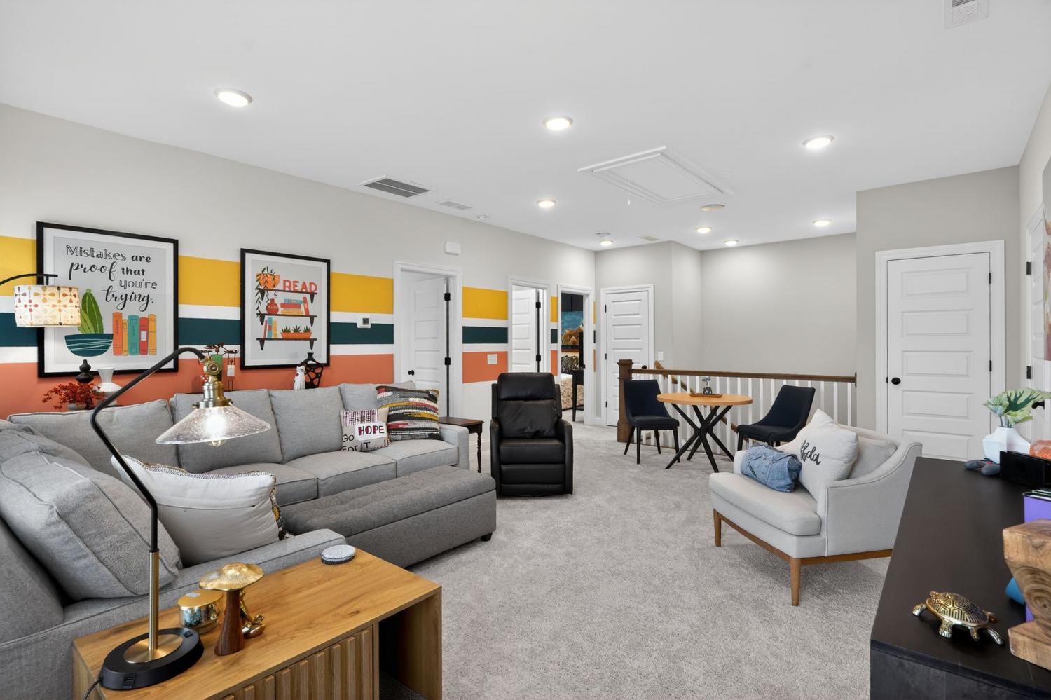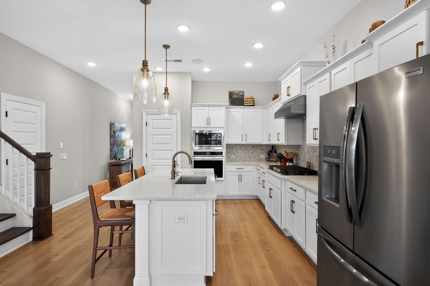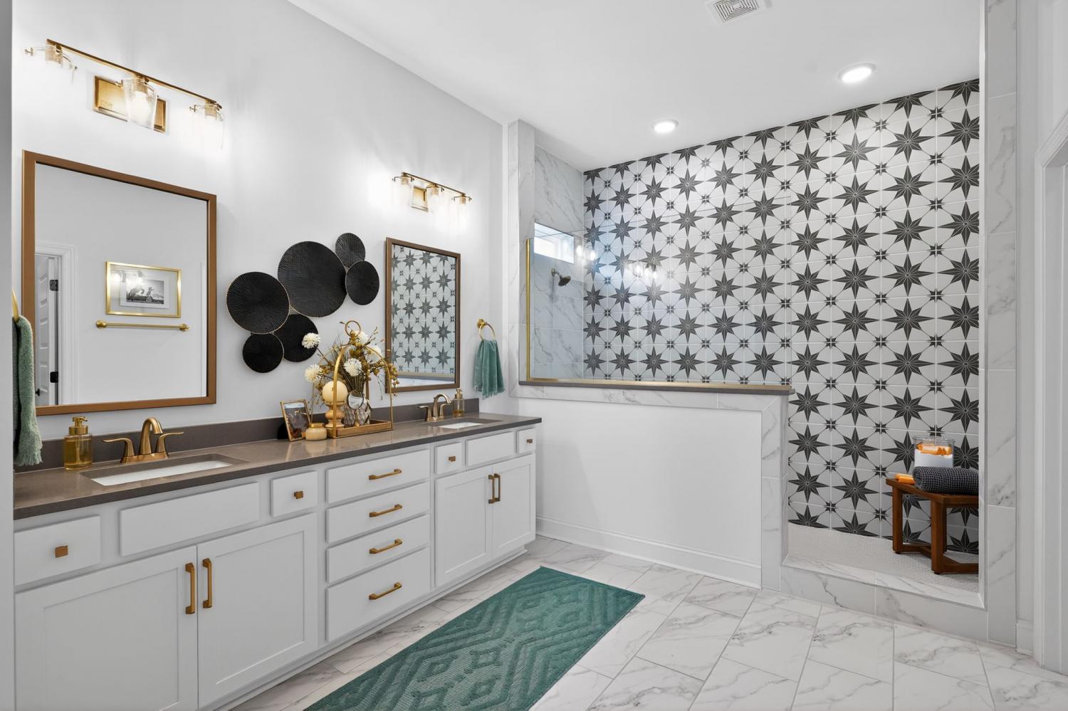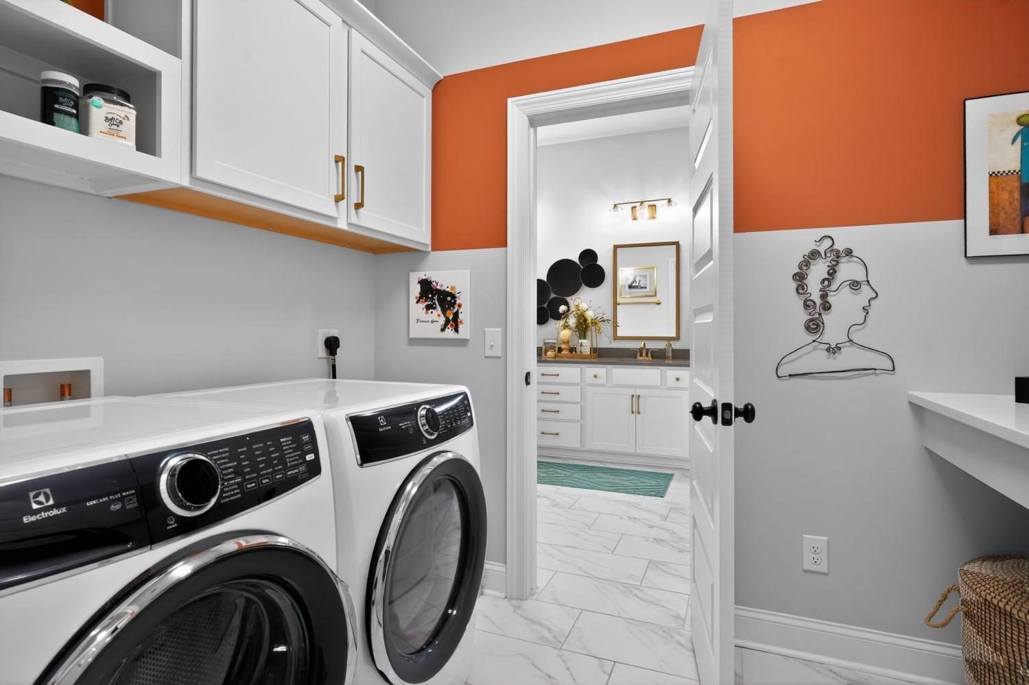Welcome to the model home that truly has it all. Built in 2023 and lived in for only one year, this stunning 4 bed, 3 bath home offering 2,926 sqft is packed with designer finishes, custom upgrades, and magazine-worthy details throughout. From the moment you step inside, you’re welcomed by a stylish, cozy reading nook before the home opens into an impressive open-concept living space filled with natural light. The bright white chef’s kitchen is the showstopper, featuring gold accents, gas cooktop, built-in oven and microwave, oversized center island, two pantries (including a walk-in), and light oak flooring that flows throughout the main living areas. The kitchen opens seamlessly into the dining space highlighted by a statement gold chandelier and into the great room where a dramatic floor-to-ceiling vertical wood slat accent wall creates an unforgettable focal point. The primary suite on the main floor feels like a private retreat with wall-to-wall windows, a designer accent wall, and elegant chandelier. The spa-inspired bathroom showcases a massive walk-in shower with bench, floor-to-ceiling Moroccan star tile, marble accent wall, penny mosaic tile flooring, double vanity with gold fixtures, linen closet, and private water closet. The custom walk-in closet with built-ins connects directly to the laundry room for everyday convenience. Additional upgrades include custom closet systems throughout, a drop-zone with cubbies off the garage, guest bath with modern black tile and gold accents, epoxy garage flooring with extra storage, and a whole-home generator for peace of mind. Upstairs offers a spacious bonus room plus two additional bedrooms and a full bath with double vanity. Enjoy peaceful mornings on the covered back patio overlooking a level, tree-lined yard or relax on the charming covered front porch swing. Community amenities include a pool and park, offering the perfect blend of luxury, comfort, and lifestyle.