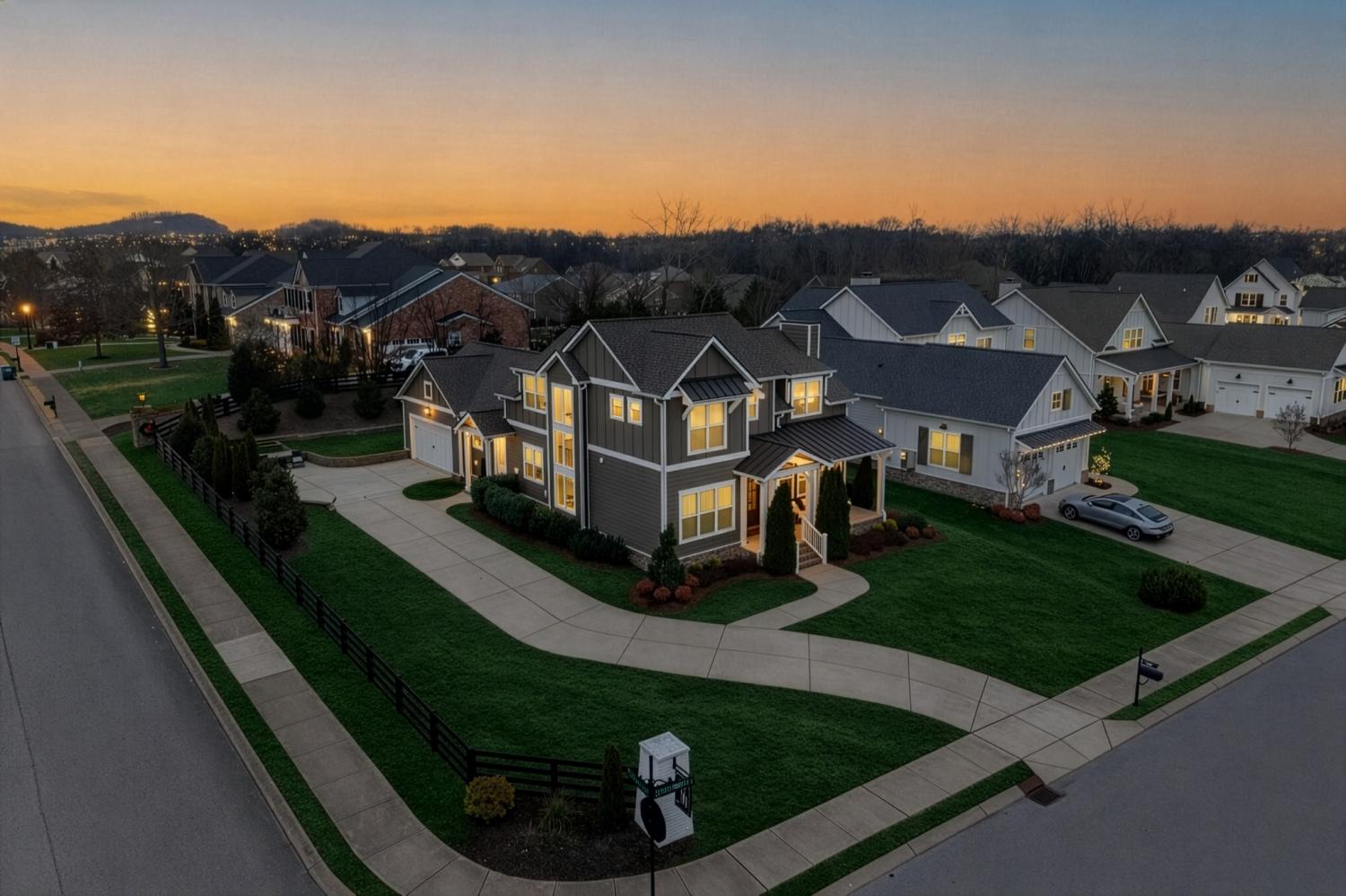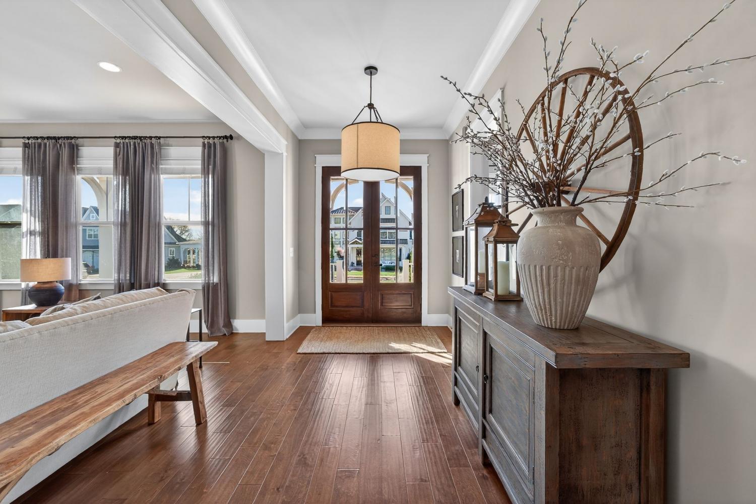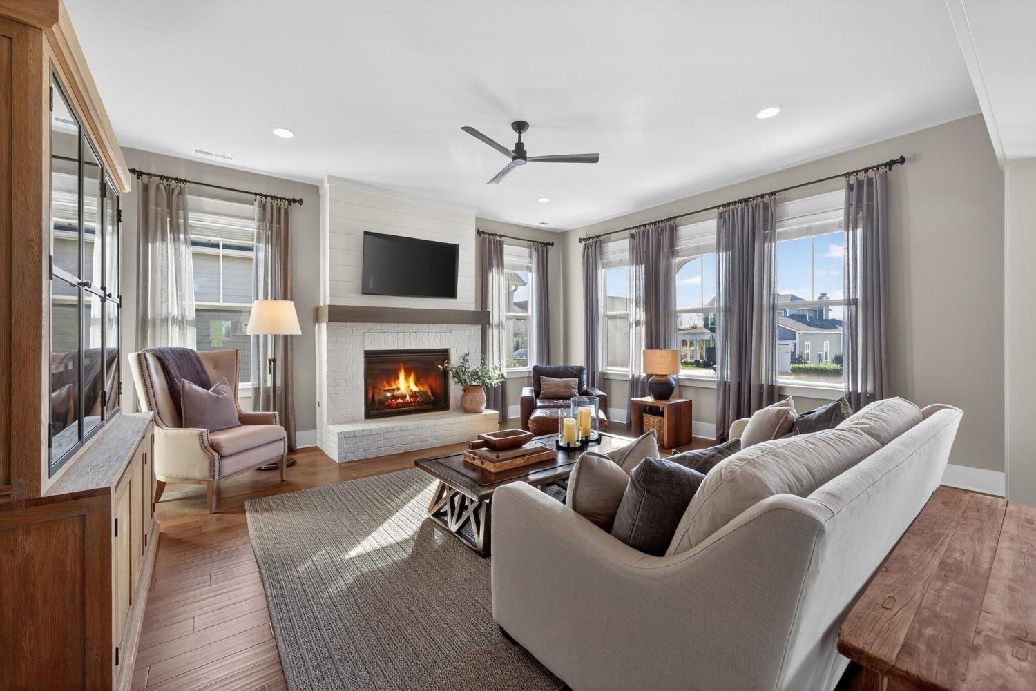 Situated in a desirable, boutique neighborhood in Williamson County, this home has the "Wow" factor showcasing stunning architecture, character, and fine touches throughout: Restoration Hardware, Pottery Barn, Graham's Lighting fixtures- hardware & draperies remain - Highly walkable location- dining, Harvey park, sidewalks and retail! The moment you step inside, you feel at home. High ceilings give a grand impression that you have to see in person. Welcoming entry, wood flooring throughout home, accent walls, living room w/ fireplace, primary and secondary bedroom/office on the main level. Secondary bath offers walk-in tiled shower and designer wall paper. Open designed, spacious kitchen with generous island, leathered granite countertops, wall oven, walk-in pantry, and gas cooktop -overlooking a dedicated dining area. Primary suite with vaulted ceiling. Spa-like Primary bath- extensive quartz dual vanity, freestanding tub, and extended, tiled shower. Floating design staircase leads to thoughtfully laid out upper level. Recreation room (or 5th BR) with walk-in closet and private bath. 2 Additional Bedrooms- Jack-Jill Bath w/ private vanity areas. Exterior features a side "tower" with windows, and friend's entry, tasteful landscaping, lighting, firepit, front porch, and covered entertainer's porch. This home and neighborhood are not "cookie cutter!" Come and see the difference! Zoned for new Amanda North elementary school! *up to $10,000 Lender Incentive with Hilary Hollingsworth-Modern Mortgage 615-236-6054 for qualified buyers to use for closing costs or rate buy down! Quick Closing- move right in!