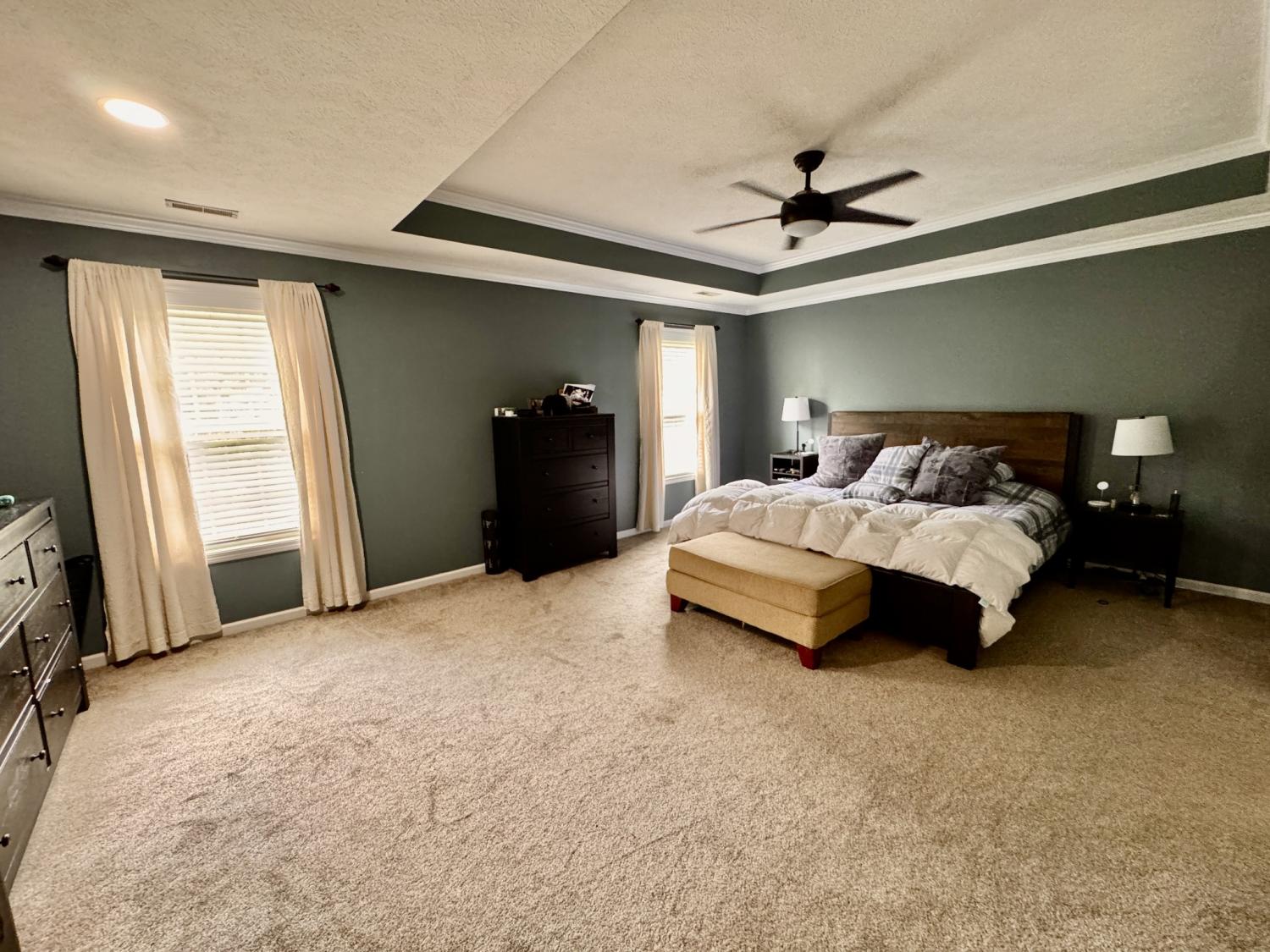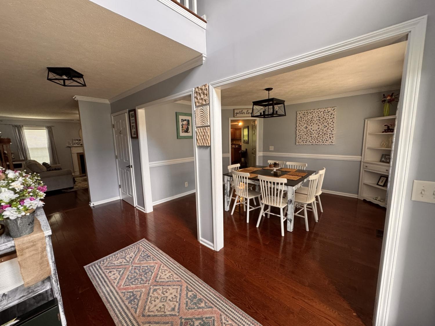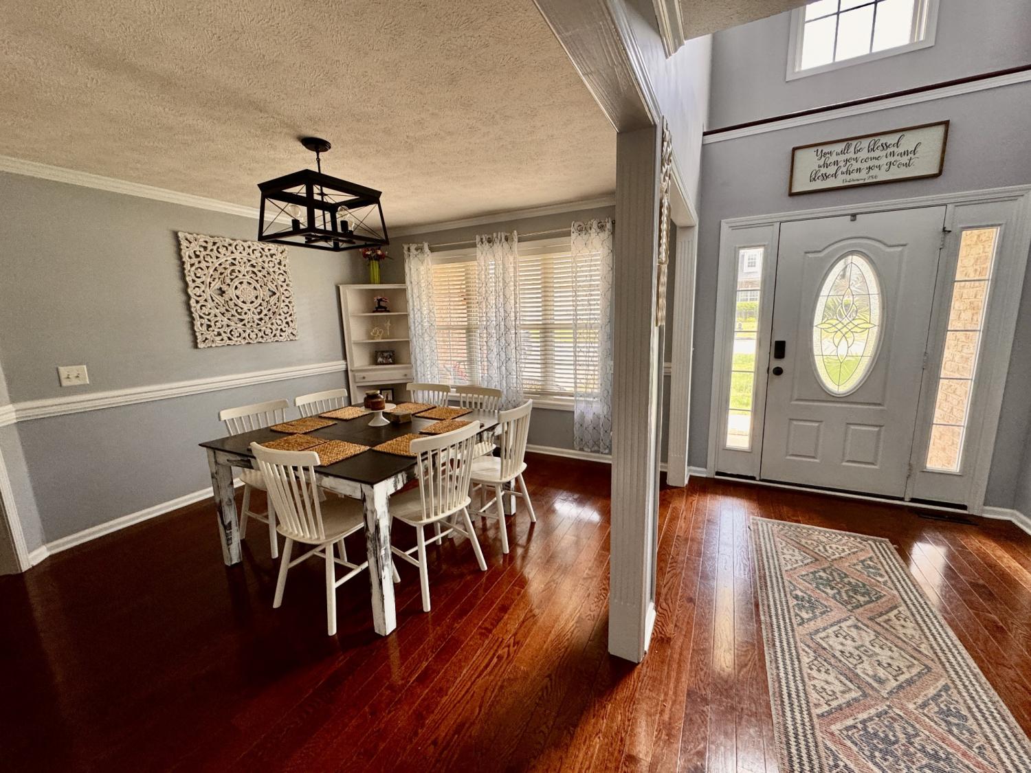 Impressive open floor plan featuring beautiful hardwood flooring throughout. The spacious eat-in kitchen offers abundant cabinetry, a walk-in pantry, and a center island—perfect for everyday living and entertaining. Formal dining room showcases chair rail, crown molding, and hardwood floors. Oversized bonus room upstairs provides endless flexibility. Convenient guest bedroom on the main level. The primary suite includes a cozy sitting area and a large walk-in closet with custom shelving. Enjoy a peaceful backyard setting with a creek running along the rear of the property.