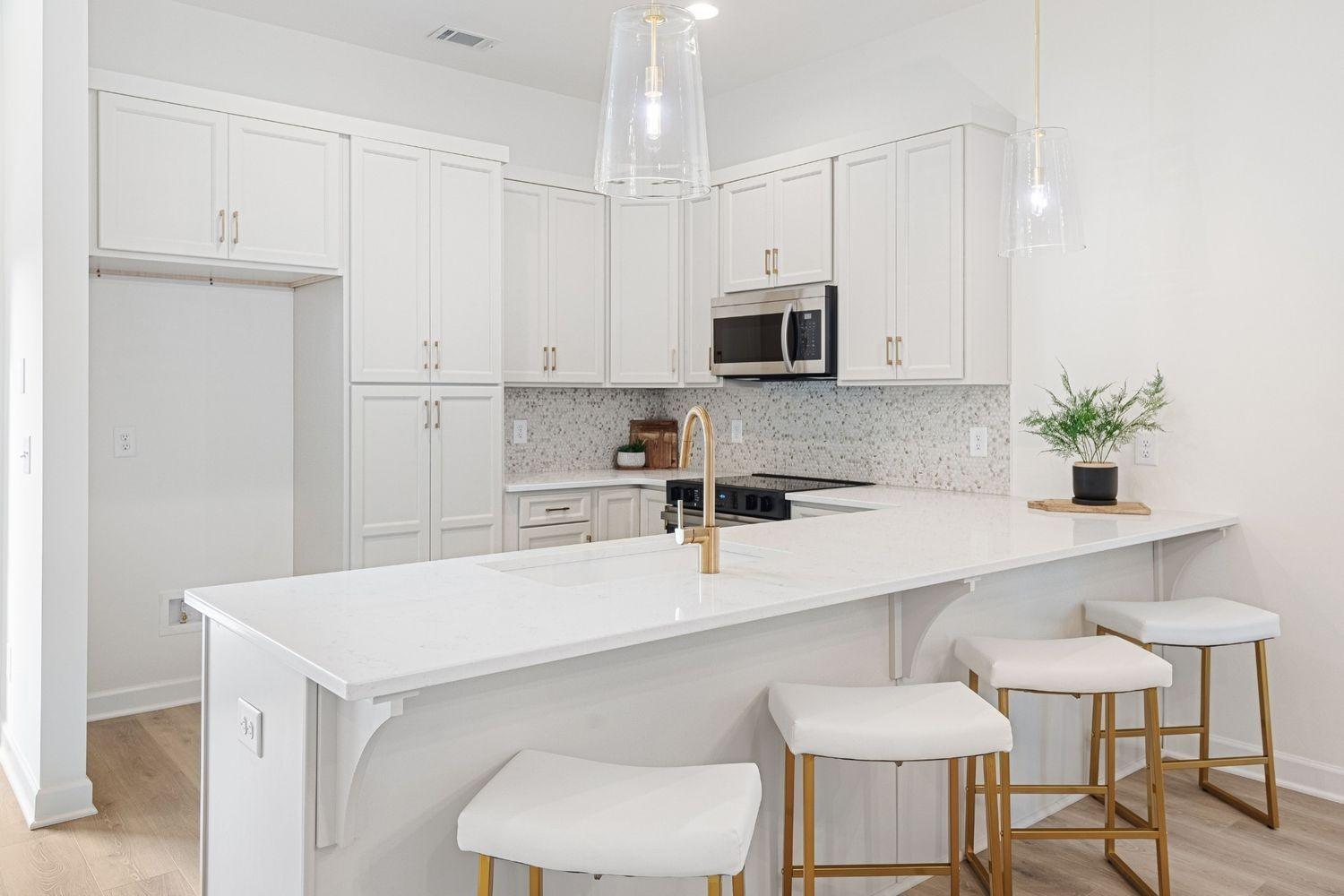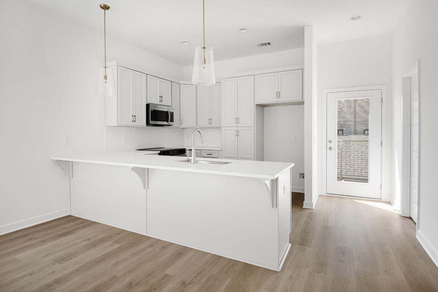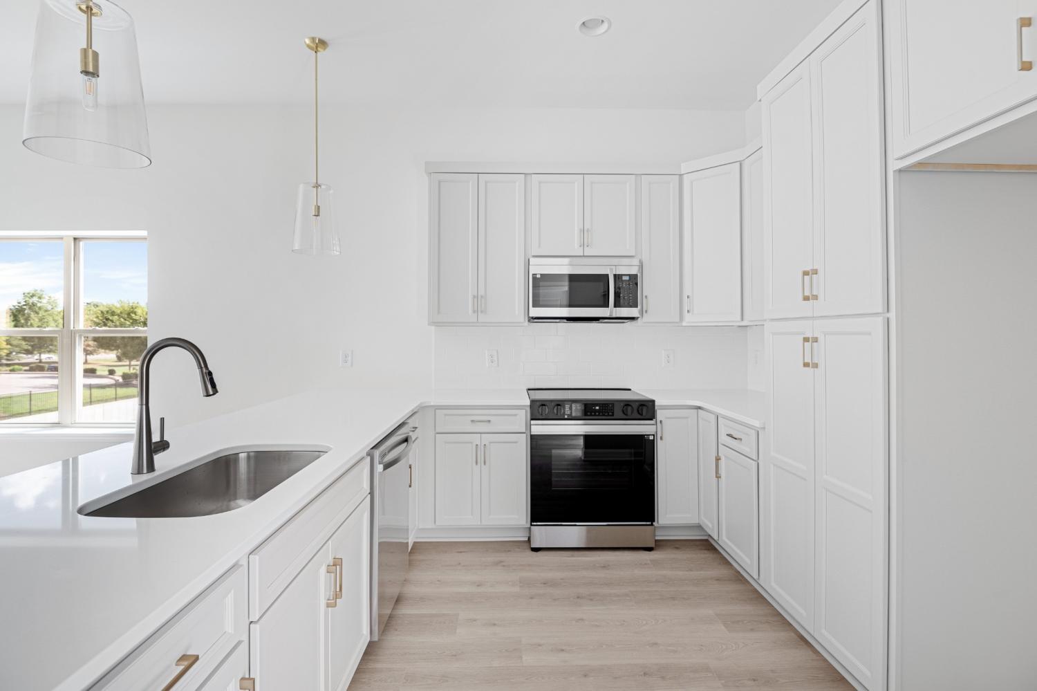 Welcome to elevated suburban living! This stunning, brand new, two-story end unit condo delivers an unparalleled blend of modern style and functional design, perfectly tailored for the style-conscious homebuyer. Featuring designer finishes throughout, including soaring 10-foot ceilings, an open-concept loft layout, and Mohawk Revwood laminate flooring (carpet-free!) over both levels, complemented by a striking solid wood staircase. The chef's kitchen is a true showstopper with elegant Quartz countertops, a massive 9+ ft peninsula island, custom soft-close cabinetry, and stainless steel appliances. The home features two generously sized bedrooms, both with their own private en suite bathrooms for ultimate privacy. Further enhancing convenience is a 2-car garage and a premier location walkable to shops, restaurants, and more. Ready for immediate move-in, this unit is ideal for someone looking to move right in or the savvy investor looking for an immediate rental opportunity. GENEROUS BUILDER INCENTIVES AVAILABLE! Contact agent for specific details. Photos, measurements, and other listing data are provided as estimates only and may depict similar but not identical units or features. Buyer acknowledges this and must rely solely upon their own independent inspections and due diligence to verify all property details.