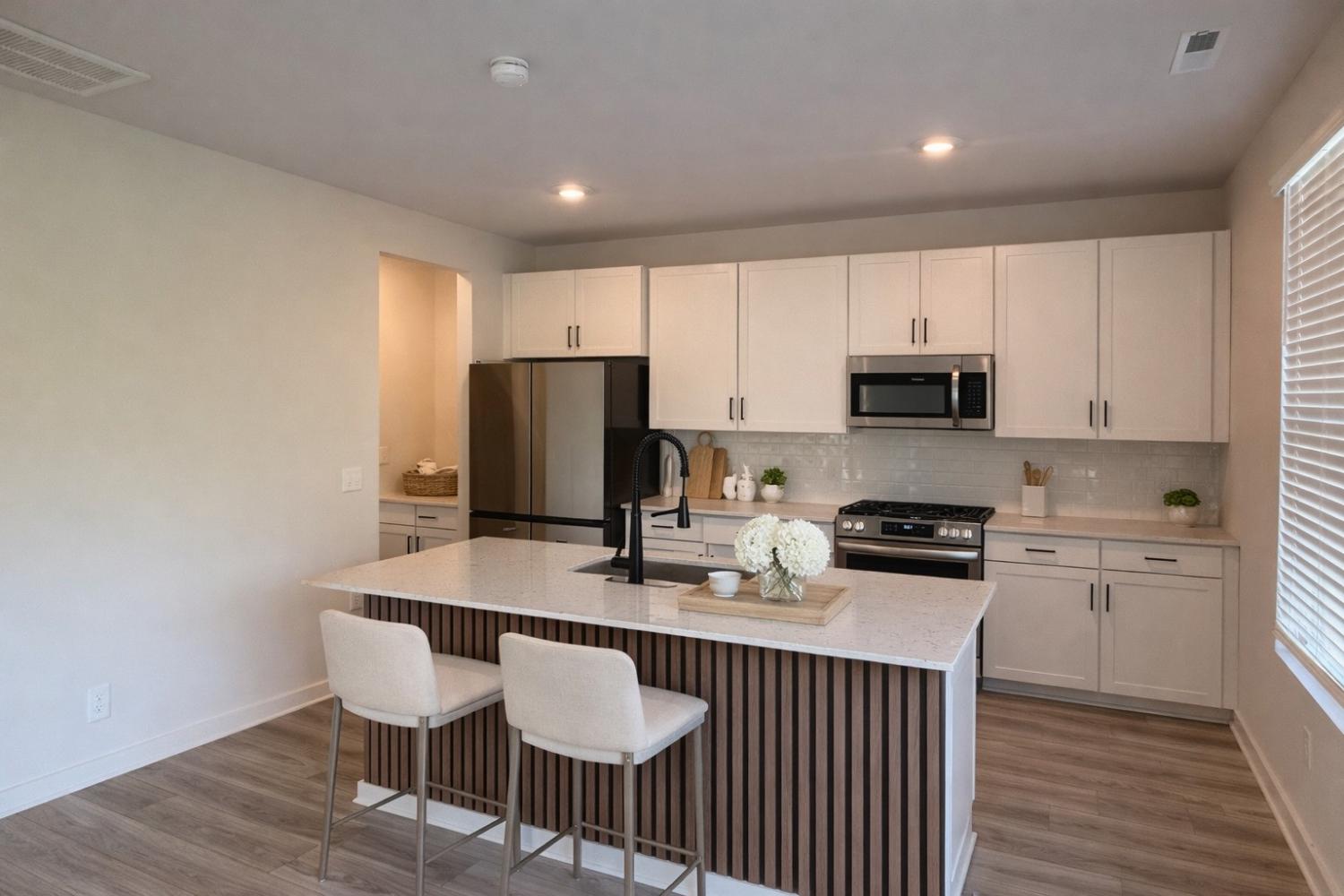 Elegant brick and hardiboard home in a desirable master planned community. This Hamilton floor plan offers 4 bedrooms, 2.5 baths, and 2,042 square feet with an open, light filled layout designed for both everyday living and entertaining. The kitchen features 42 inch shaker style cabinetry, quartz countertops, tile backsplash, stainless steel appliances, and a large center island overlooking the dining and living areas. The spacious primary suite includes a double vanity with quartz tops and an oversized walk in ceramic tile shower with built in bench. LVP flooring runs throughout the main living areas with tile in secondary baths and laundry. Additional highlights include generously sized bedrooms, ample closet space, a functional drop zone, and 2 inch faux wood blinds. Recent updates include fresh paint and custom decorative wall accents that add character throughout the home. The property backs to open space, offering a more private setting than many in the neighborhood. Smart home features include Ring doorbell, Schlage keyless entry, and Honeywell WiFi thermostat. 2 car front entry garage.