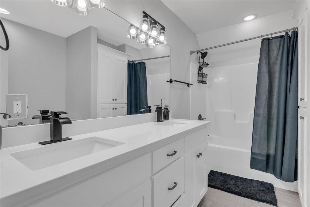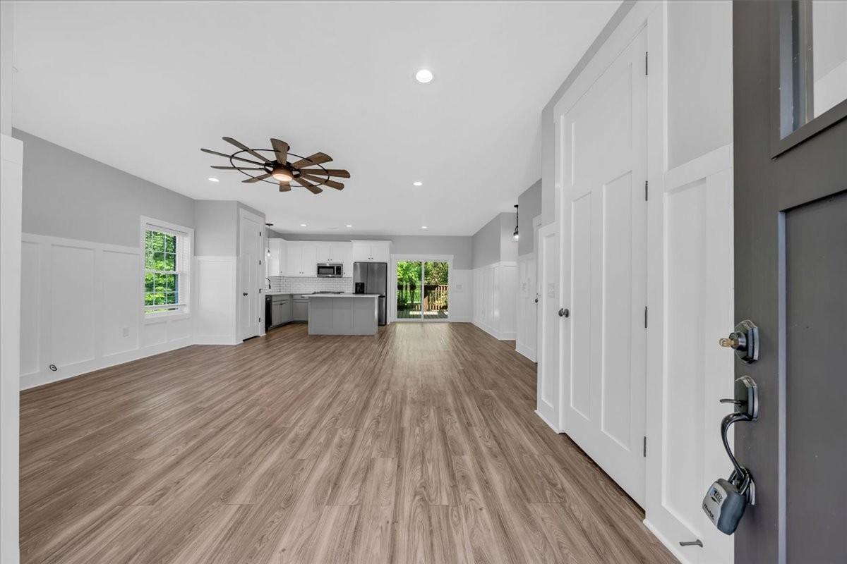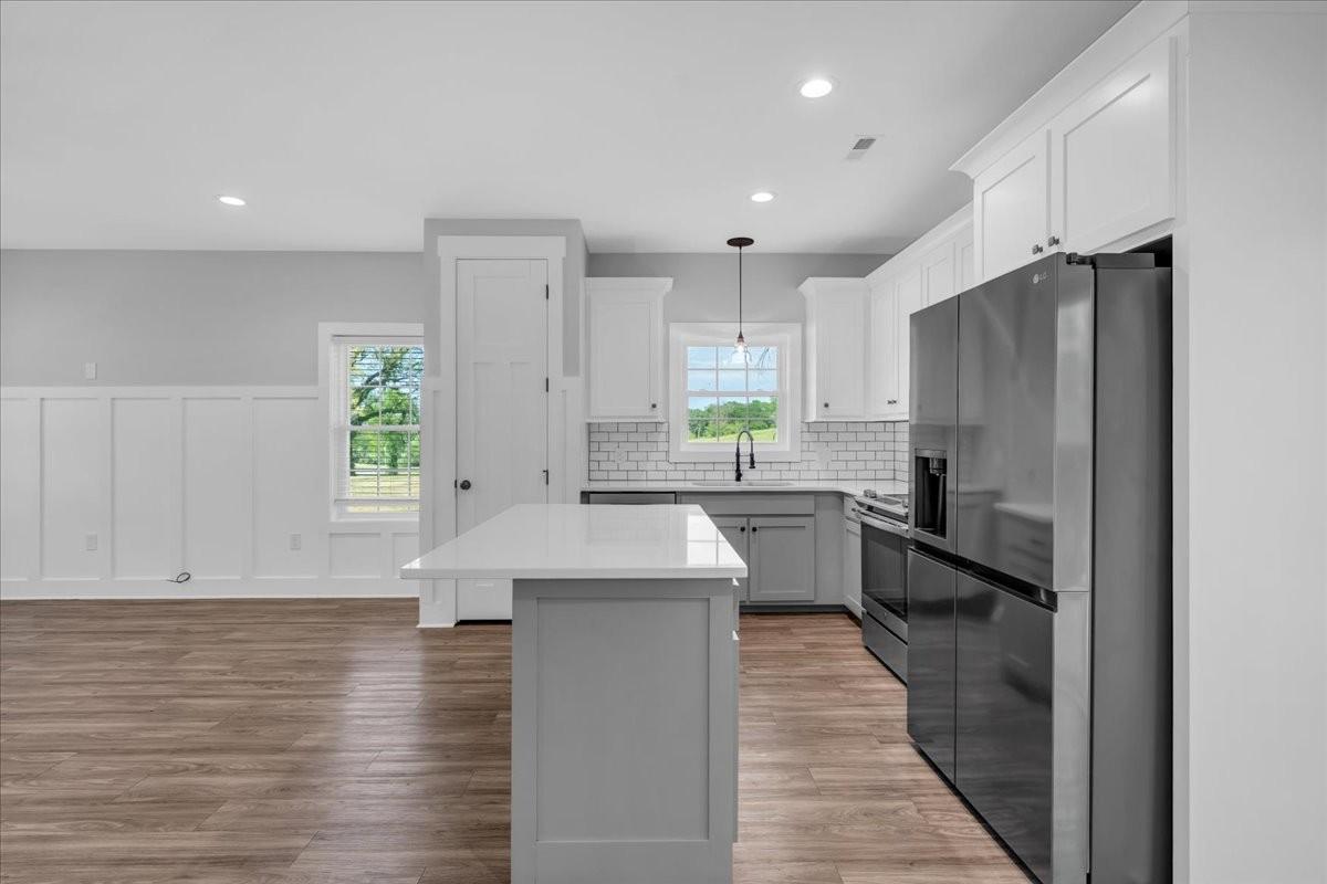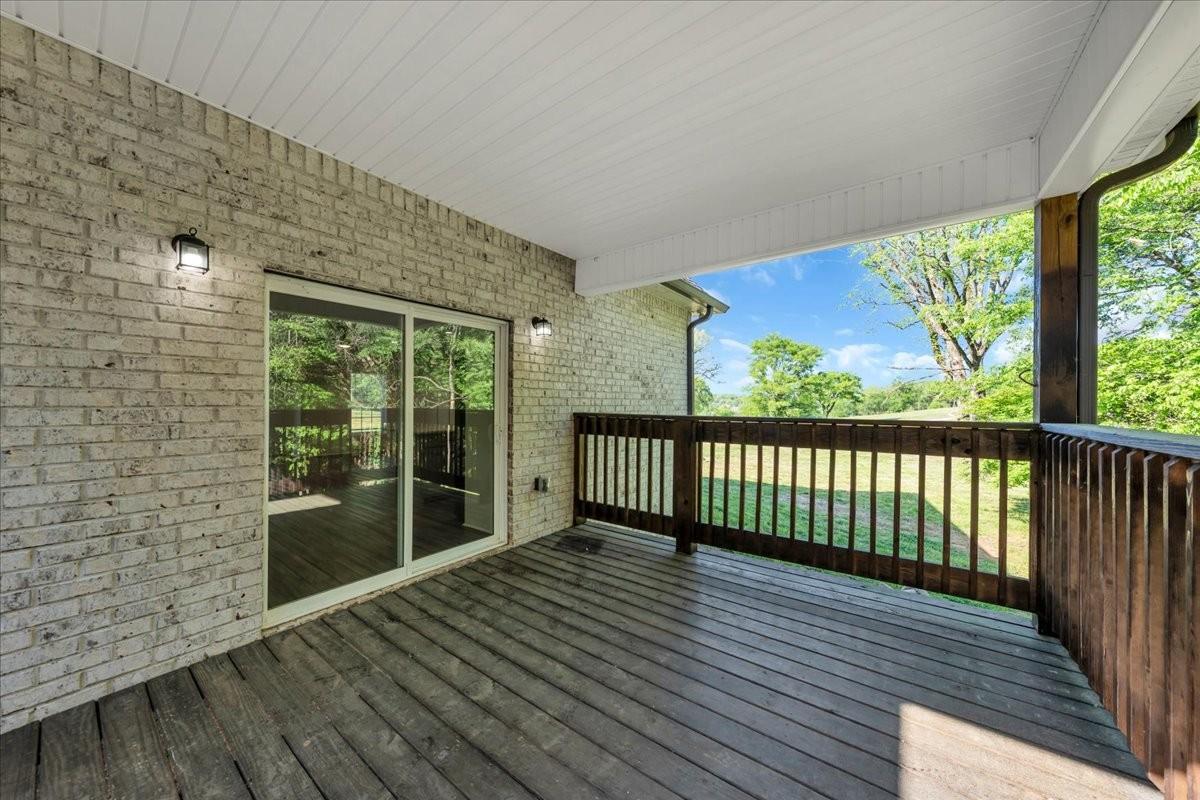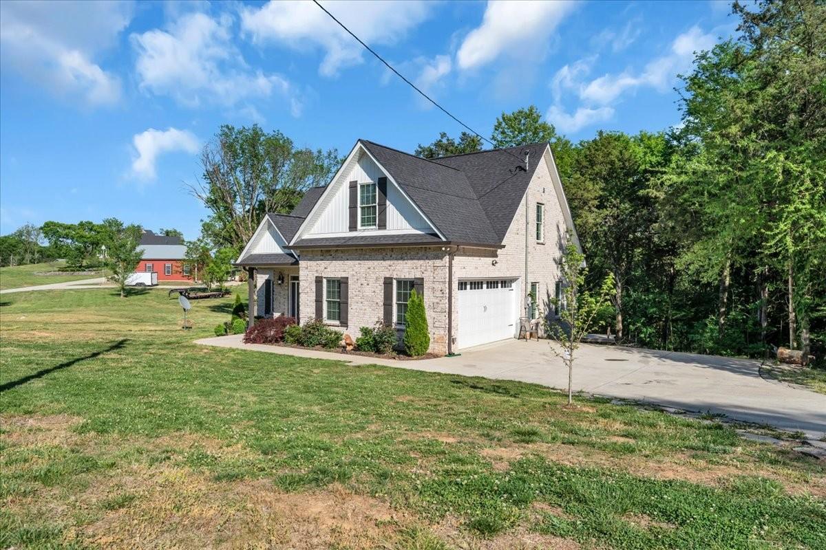 Located in Bell Buckle, this brick home offers a clean modern farmhouse feel with an inviting front porch, detailed trim work, and established landscaping. Inside, the open main level features wide‑plank flooring, board‑and‑batten wainscoting, and a spacious living area that flows into the kitchen and dining spaces. The kitchen includes shaker‑style cabinetry, a large island, subway tile backsplash, stainless appliances, and a window over the sink that frames a pleasant view. Sliding glass doors off the dining area open to a rear deck overlooking a tree‑lined backdrop, creating an easy indoor/outdoor gathering area. The main‑level suite shows off a generous bedroom with ceiling fan and a bath with double vanity, soaking tub with tile surround, and separate shower area. Additional bedrooms continue the neutral color palette and offer good natural light. Thoughtful storage is available throughout the home with multiple closets and a walk‑in pantry. The setting provides a yard with room for everyday use while maintaining a comfortable sense of privacy along the wooded edge. A versatile layout and move‑in ready finishes make this home easy to enjoy.