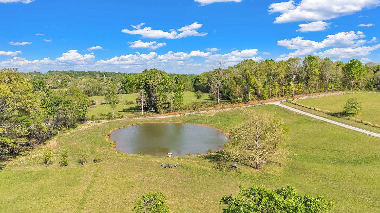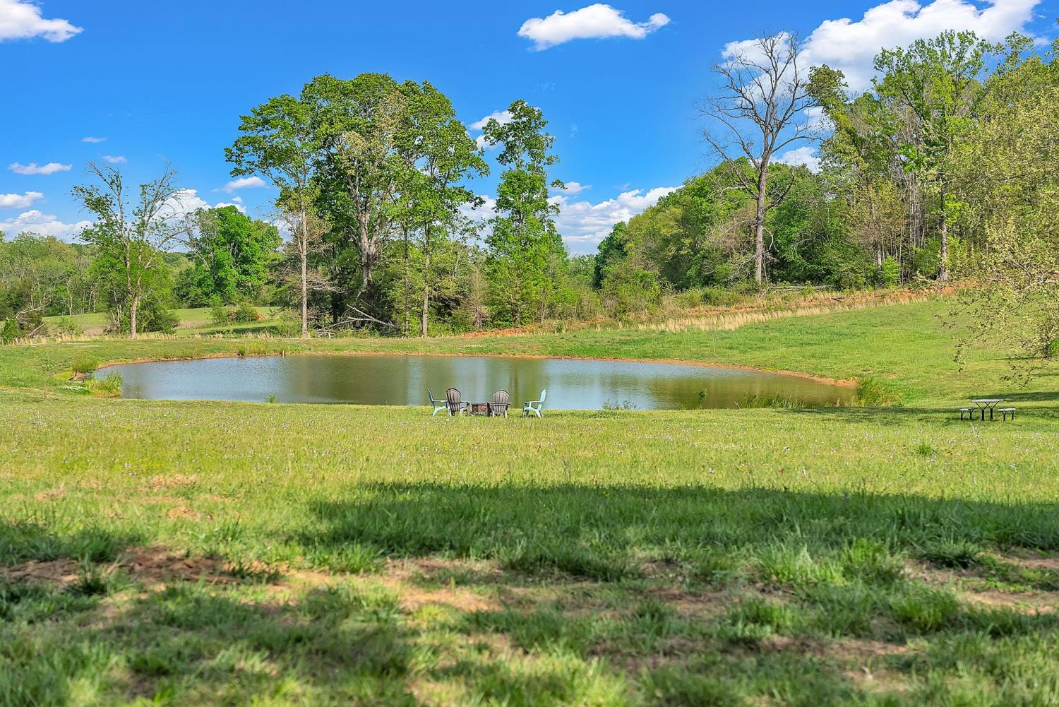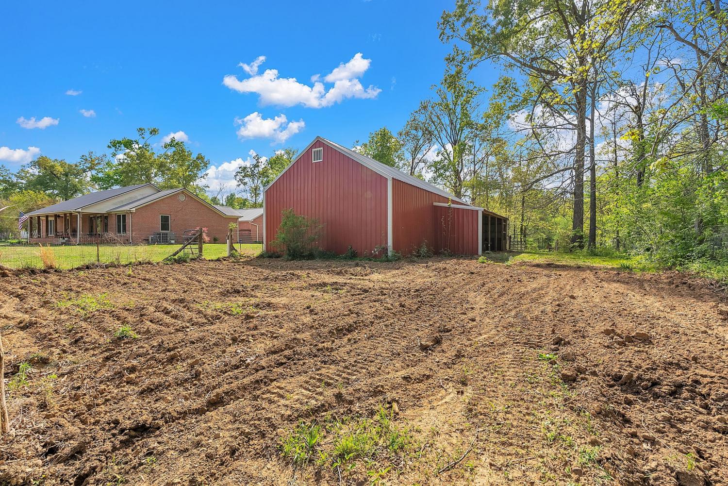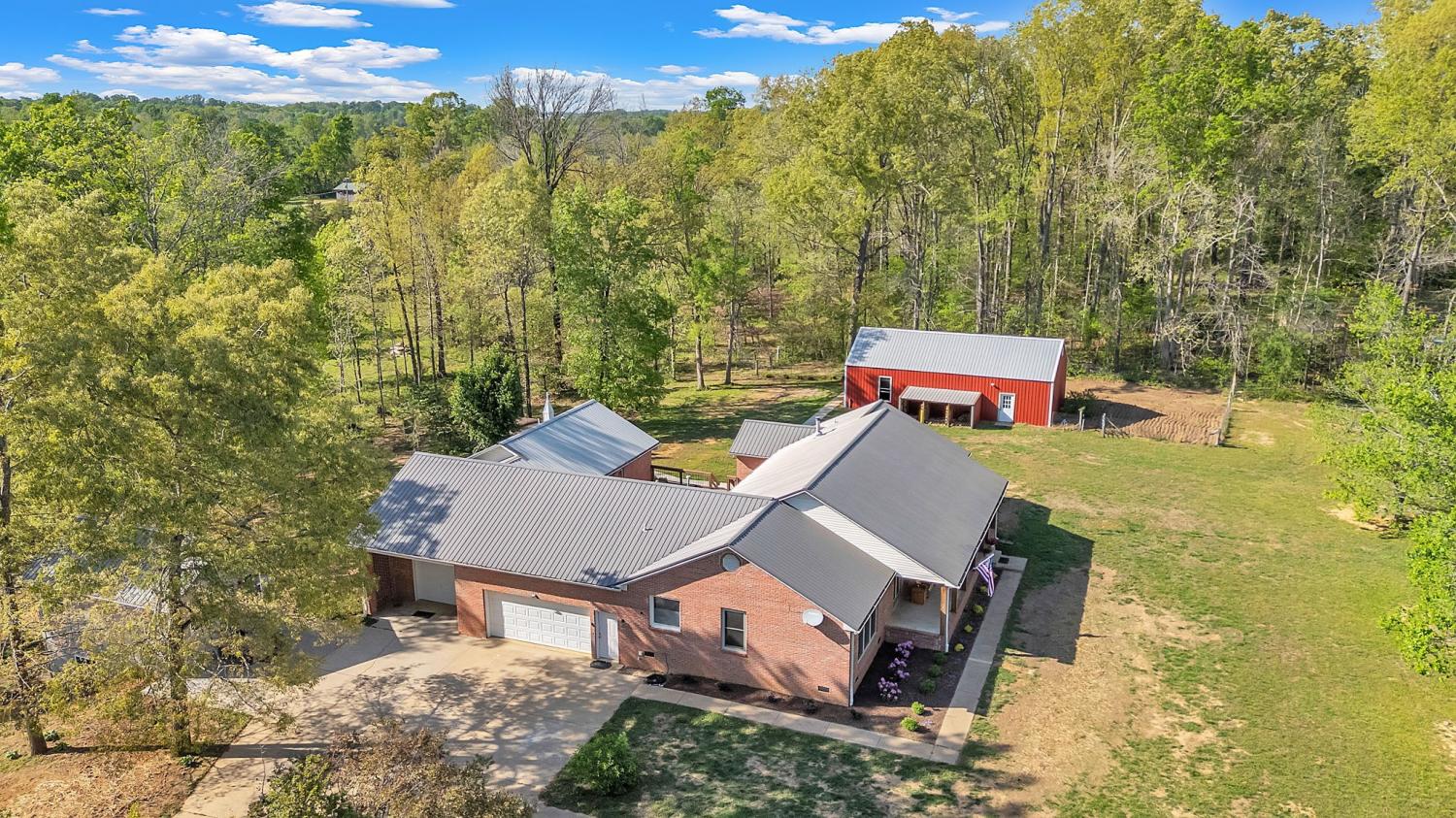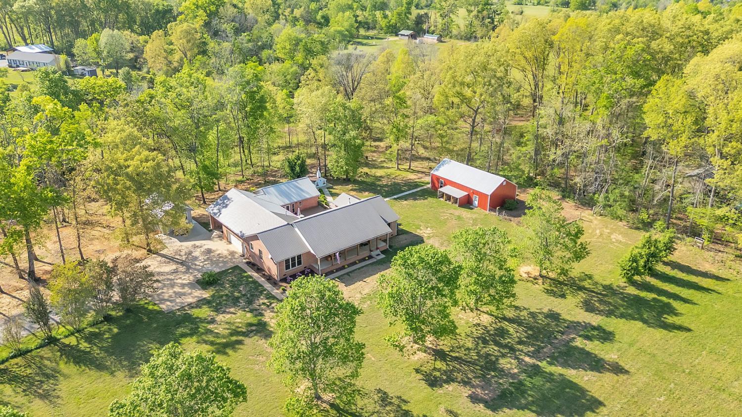 Stunning 5.8-Acre Country Estate with Stocked Pond Fully remodeled private retreat just one mile from I-65! This beautifully maintained 5.8-acre property features a serene ¾-acre stocked pond (15 ft deep) teeming with catfish & bluegill, open pasture, and wooded privacy. A breathtaking entrance lined with 21 mature crepe myrtles bursts with pink, purple, red, and white blooms each season. Wildlife abounds—deer, turkey, ducks, and geese frequent the pond, offering peaceful sunrise and moonrise views from the east-facing home and expansive front porch. The fully remodeled single-level, ranch home boasts a spacious open-concept layout with durable new Pergo wood flooring throughout. The chef’s kitchen shines w/ crisp white shaker cabinets, matte black hardware, “White Ice” granite countertops, a massive 7’6” x 5’1” island seating four, & new GE Profile appliances. It flows seamlessly into the living & dining areas, anchored by a cozy wood-burning stove. A separate pantry/study/office offers built-in granite counters and floating shelves. A luxurious primary suite bath with claw-foot soaking tub, walk-in shower, & double vanity. Two additional bedrooms share a full bath, plus a convenient updated powder room & laundry area. A generous 730 sq ft deck connects the main home to the attached 1,260 sq ft three-car garage with abundant storage. A fully self-contained 680 sqft guest house/mother-in-law suite provides a private bedroom, full bath, eat-in kitchen, living room, & washer/dryer hookups-ideal for extended family or rental income. Additional highlights: 544 sq ft Workshop w/ garage opener. Detached 384 sqft Studio/Office with vaulted beamed ceilings, new mini-split HVAC, & basement storm shelter/storage. 1,152 sq ft Pole Barn with concrete floors, 220amp service, loft storage, lean-to livestock area, workbenches, fenced 2,000 sqft garden, & optional hay production. A rare find offering privacy, convenience, and country charm! Your perfect mini farm.