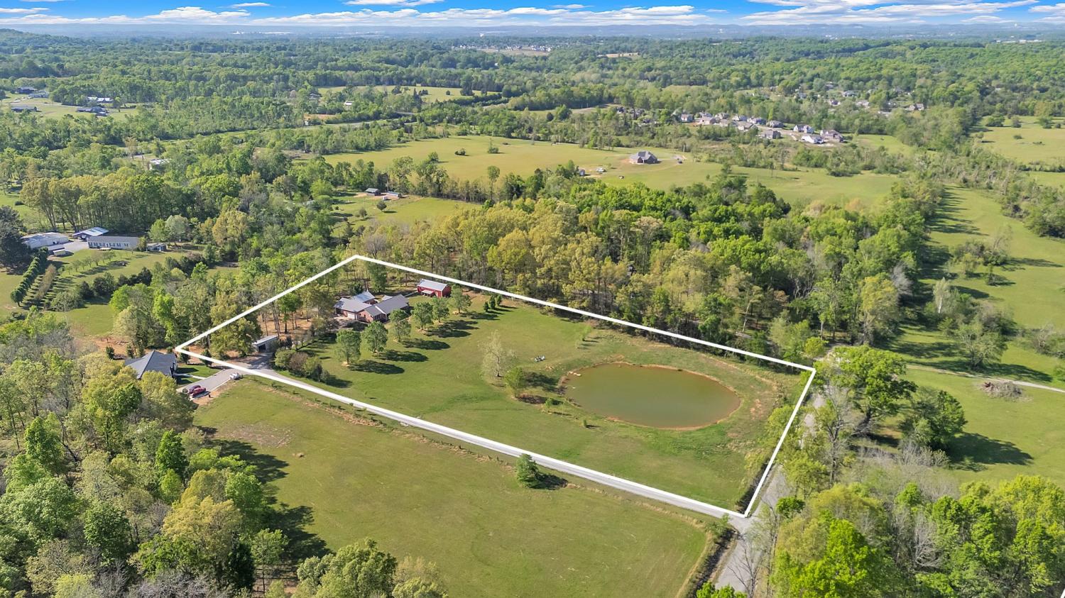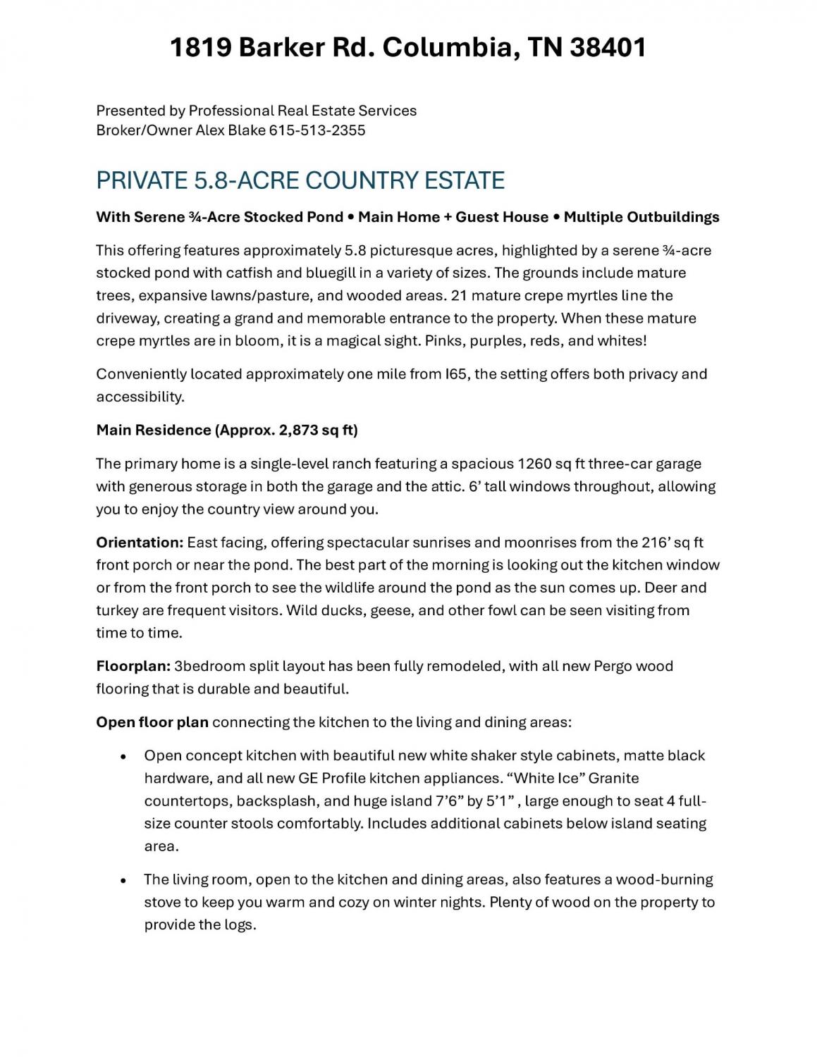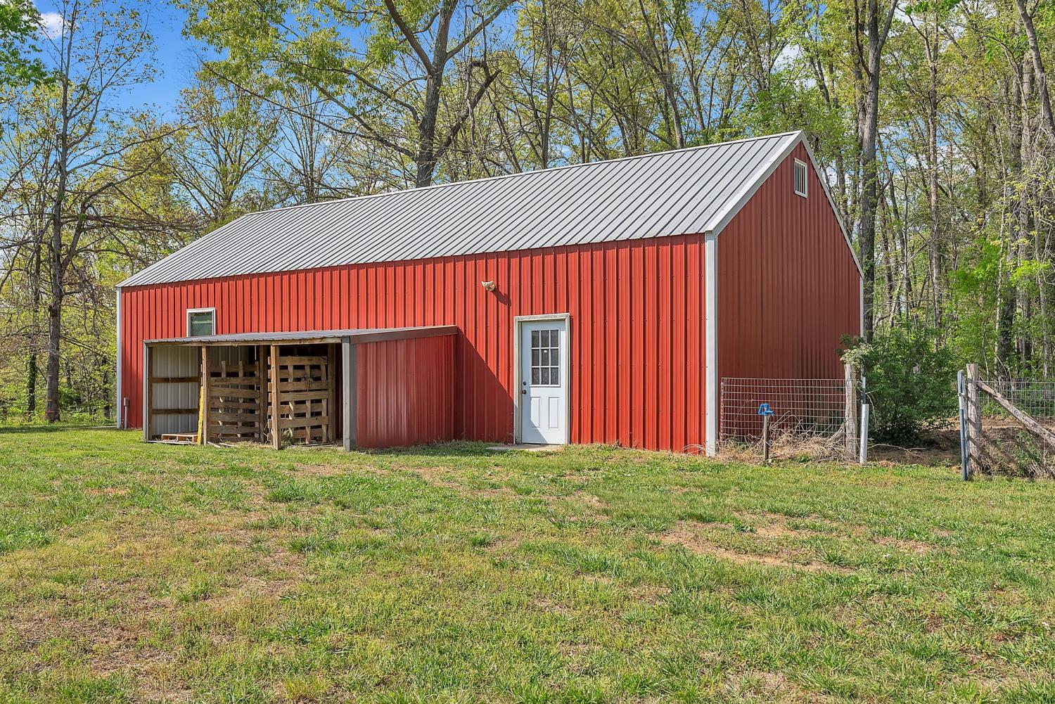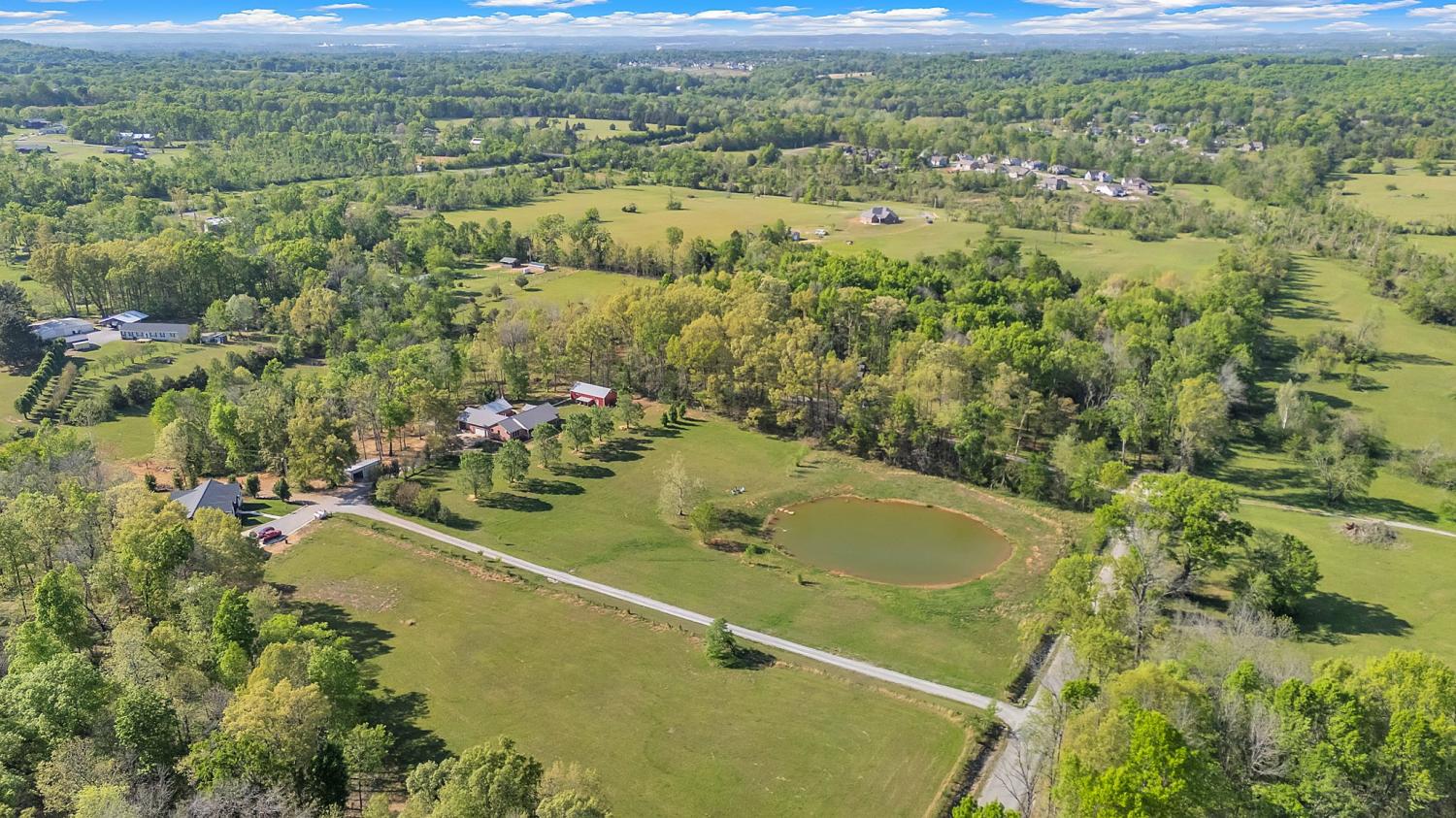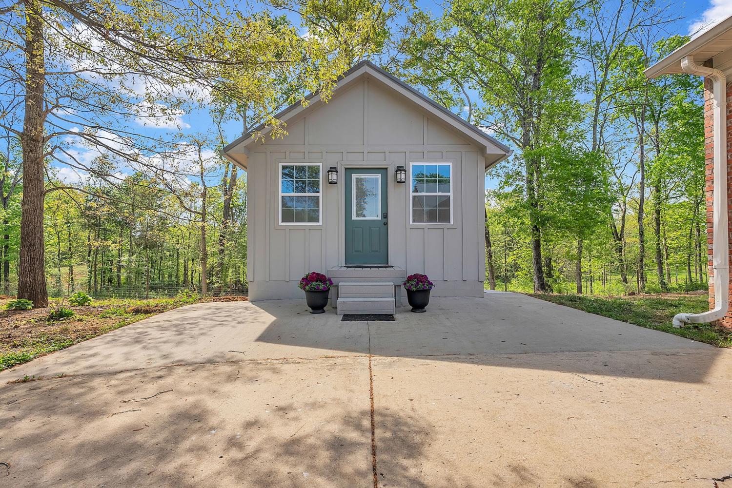 Stunning 5.8-Acre Country Estate with Stocked Pond Fully remodeled private retreat just one mile from I-65! This beautifully maintained 5.8-acre property features a serene ¾-acre stocked pond (15 ft deep) teeming with catfish & bluegill, open pasture, and wooded privacy. A breathtaking entrance lined with 21 mature crepe myrtles bursts with pink, purple, red, and white blooms each season. Wildlife abounds—deer, turkey, ducks, and geese frequent the pond, offering peaceful sunrise and moonrise views from the east-facing home and expansive front porch. The fully remodeled single-level, ranch home boasts a spacious open-concept layout with durable new Pergo wood flooring throughout. The chef’s kitchen shines w/ crisp white shaker cabinets, matte black hardware, “White Ice” granite countertops, a massive 7’6” x 5’1” island seating four, & new GE Profile appliances. It flows seamlessly into the living & dining areas, anchored by a cozy wood-burning stove. A separate pantry/study/office offers built-in granite counters and floating shelves. A luxurious primary suite bath with claw-foot soaking tub, walk-in shower, & double vanity. Two additional bedrooms share a full bath, plus a convenient updated powder room & laundry area. A generous 730 sq ft deck connects the main home to the attached 1,260 sq ft three-car garage with abundant storage. A fully self-contained 680 sqft guest house/mother-in-law suite provides a private bedroom, full bath, eat-in kitchen, living room, & washer/dryer hookups-ideal for extended family or rental income. Additional highlights: 544 sq ft Workshop w/ garage opener. Detached 384 sqft Studio/Office with vaulted beamed ceilings, new mini-split HVAC, & basement storm shelter/storage. 1,152 sq ft Pole Barn with concrete floors, 220amp service, loft storage, lean-to livestock area, workbenches, fenced 2,000 sqft garden, & optional hay production. A rare find offering privacy, convenience, and country charm! Your perfect mini farm.