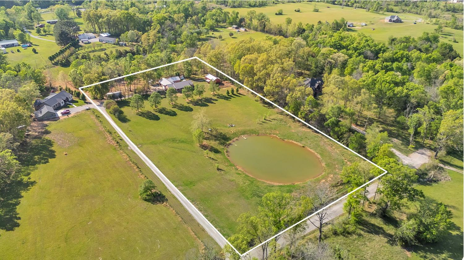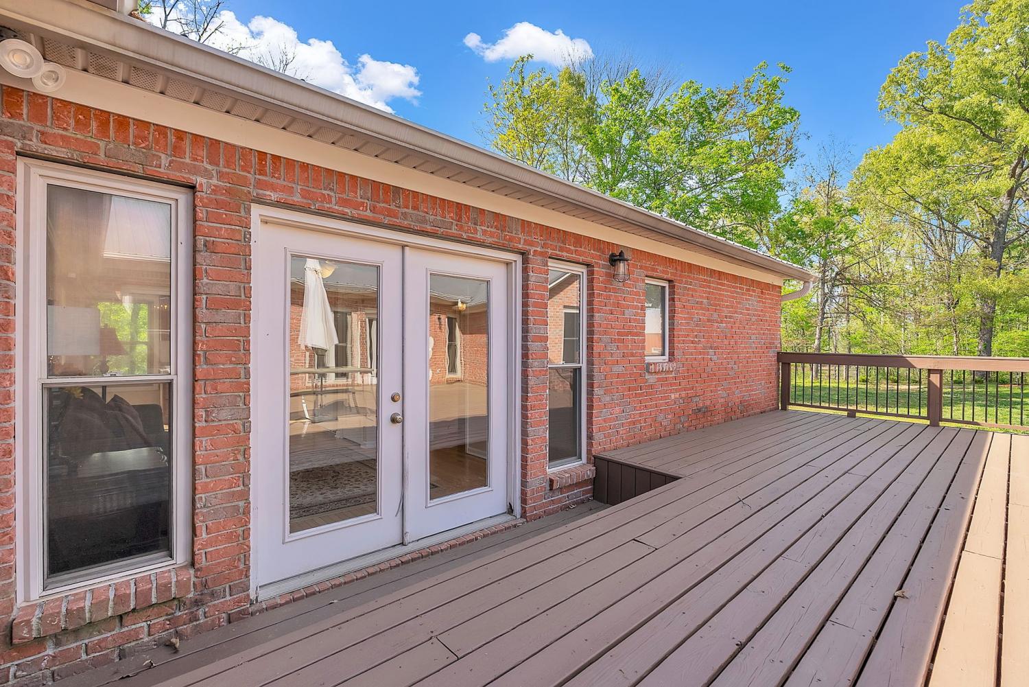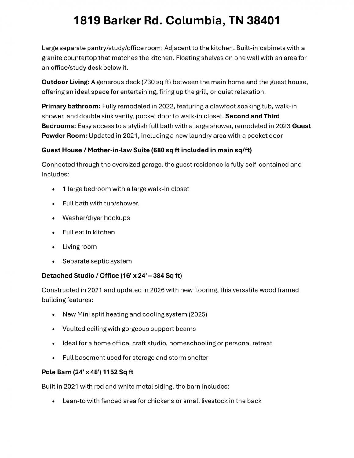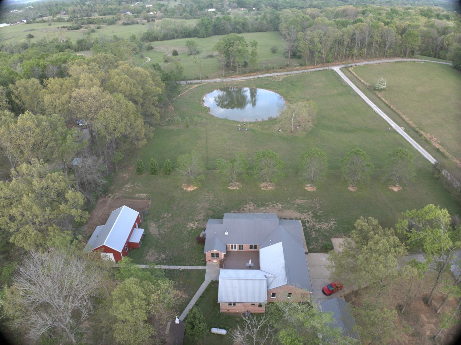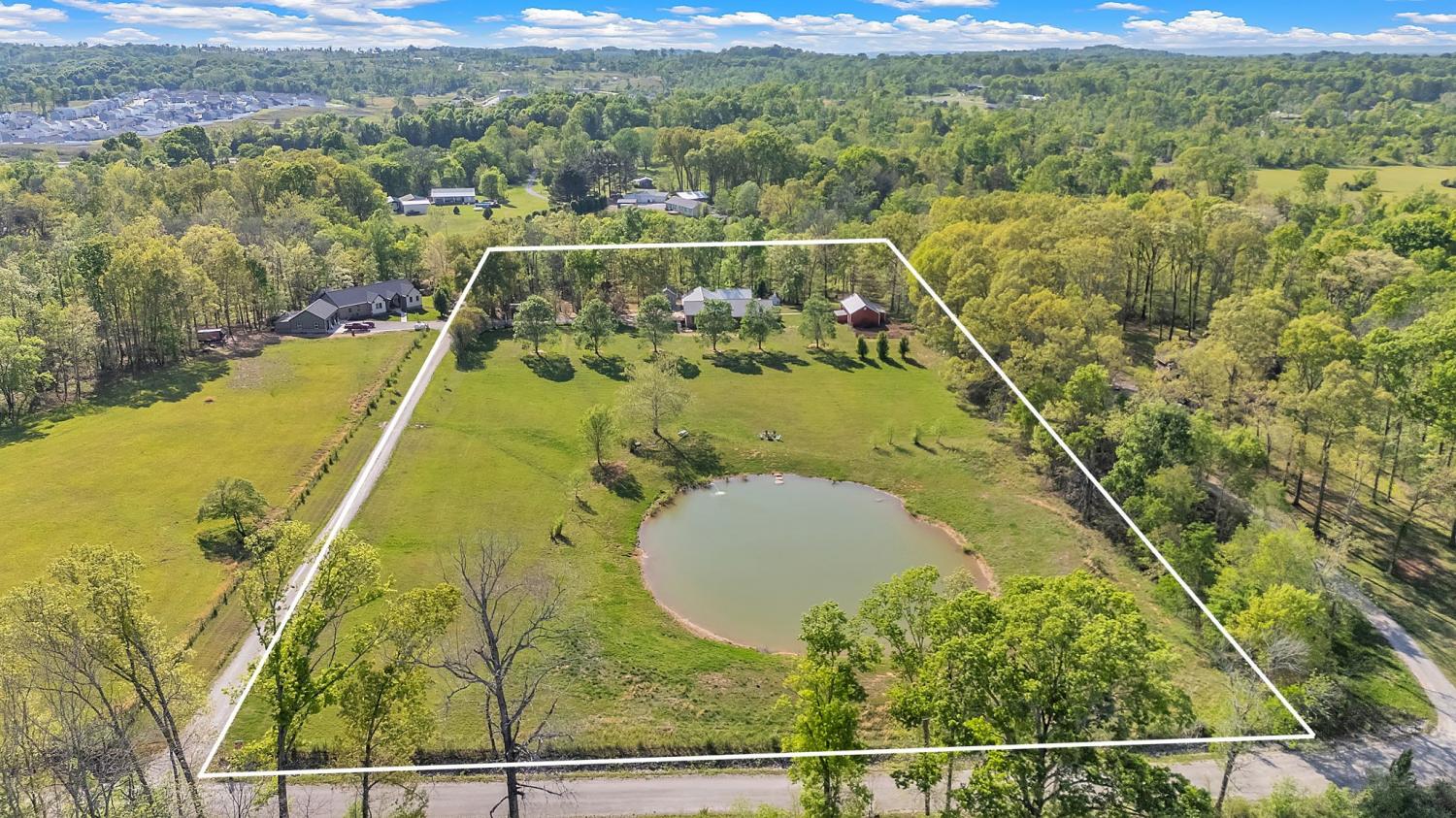 Stunning 5.8-Acre Country Estate with Stocked Pond Fully remodeled private retreat just one mile from I-65! This beautifully maintained 5.8-acre property features a serene ¾-acre stocked pond (15 ft deep) teeming with catfish & bluegill, open pasture, and wooded privacy. A breathtaking entrance lined with 21 mature crepe myrtles bursts with pink, purple, red, and white blooms each season. Wildlife abounds—deer, turkey, ducks, and geese frequent the pond, offering peaceful sunrise and moonrise views from the east-facing home and expansive front porch. The fully remodeled single-level, ranch home boasts a spacious open-concept layout with durable new Pergo wood flooring throughout. The chef’s kitchen shines w/ crisp white shaker cabinets, matte black hardware, “White Ice” granite countertops, a massive 7’6” x 5’1” island seating four, & new GE Profile appliances. It flows seamlessly into the living & dining areas, anchored by a cozy wood-burning stove. A separate pantry/study/office offers built-in granite counters and floating shelves. A luxurious primary suite bath with claw-foot soaking tub, walk-in shower, & double vanity. Two additional bedrooms share a full bath, plus a convenient updated powder room & laundry area. A generous 730 sq ft deck connects the main home to the attached 1,260 sq ft three-car garage with abundant storage. A fully self-contained 680 sqft guest house/mother-in-law suite provides a private bedroom, full bath, eat-in kitchen, living room, & washer/dryer hookups-ideal for extended family or rental income. Additional highlights: 544 sq ft Workshop w/ garage opener. Detached 384 sqft Studio/Office with vaulted beamed ceilings, new mini-split HVAC, & basement storm shelter/storage. 1,152 sq ft Pole Barn with concrete floors, 220amp service, loft storage, lean-to livestock area, workbenches, fenced 2,000 sqft garden, & optional hay production. A rare find offering privacy, convenience, and country charm! Your perfect mini farm.