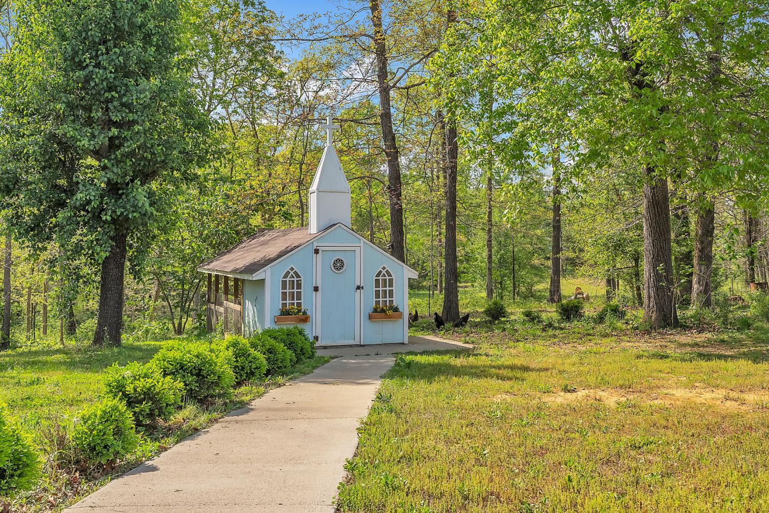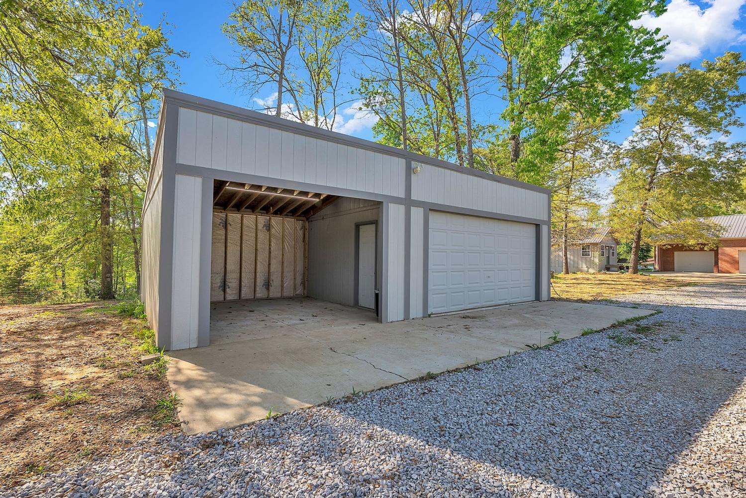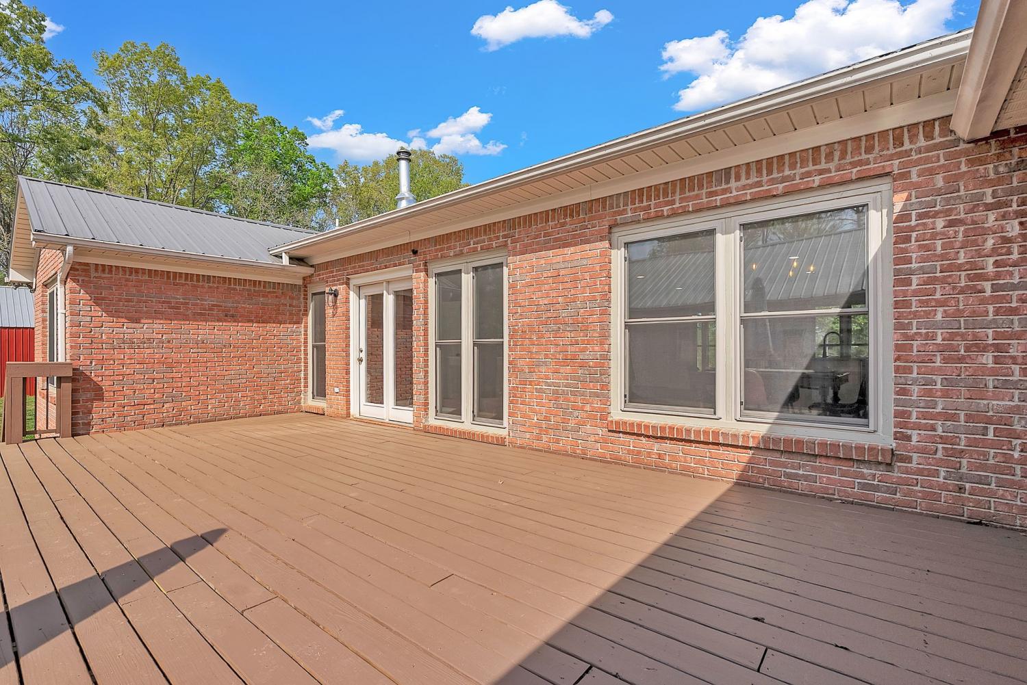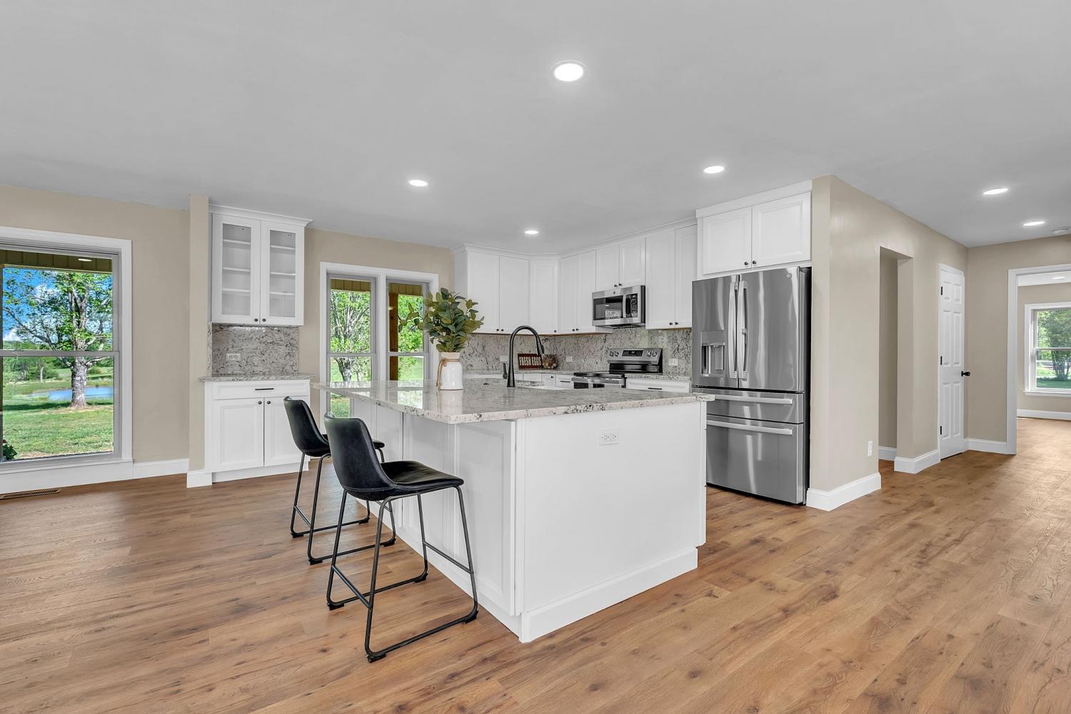 Stunning 5.8-Acre Country Estate with Stocked Pond Fully remodeled private retreat just one mile from I-65! This beautifully maintained 5.8-acre property features a serene ¾-acre stocked pond (15 ft deep) teeming with catfish & bluegill, open pasture, and wooded privacy. A breathtaking entrance lined with 21 mature crepe myrtles bursts with pink, purple, red, and white blooms each season. Wildlife abounds—deer, turkey, ducks, and geese frequent the pond, offering peaceful sunrise and moonrise views from the east-facing home and expansive front porch. The fully remodeled single-level, ranch home boasts a spacious open-concept layout with durable new Pergo wood flooring throughout. The chef’s kitchen shines w/ crisp white shaker cabinets, matte black hardware, “White Ice” granite countertops, a massive 7’6” x 5’1” island seating four, & new GE Profile appliances. It flows seamlessly into the living & dining areas, anchored by a cozy wood-burning stove. A separate pantry/study/office offers built-in granite counters and floating shelves. A luxurious primary suite bath with claw-foot soaking tub, walk-in shower, & double vanity. Two additional bedrooms share a full bath, plus a convenient updated powder room & laundry area. A generous 730 sq ft deck connects the main home to the attached 1,260 sq ft three-car garage with abundant storage. A fully self-contained 680 sqft guest house/mother-in-law suite provides a private bedroom, full bath, eat-in kitchen, living room, & washer/dryer hookups-ideal for extended family or rental income. Additional highlights: 544 sq ft Workshop w/ garage opener. Detached 384 sqft Studio/Office with vaulted beamed ceilings, new mini-split HVAC, & basement storm shelter/storage. 1,152 sq ft Pole Barn with concrete floors, 220amp service, loft storage, lean-to livestock area, workbenches, fenced 2,000 sqft garden, & optional hay production. A rare find offering privacy, convenience, and country charm! Your perfect mini farm.