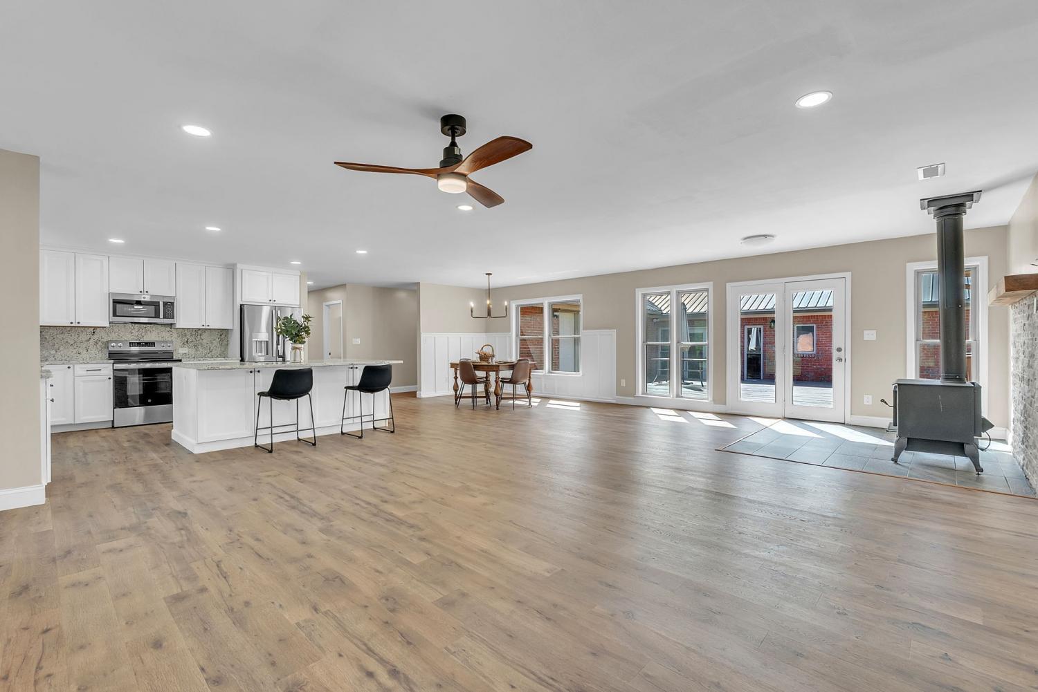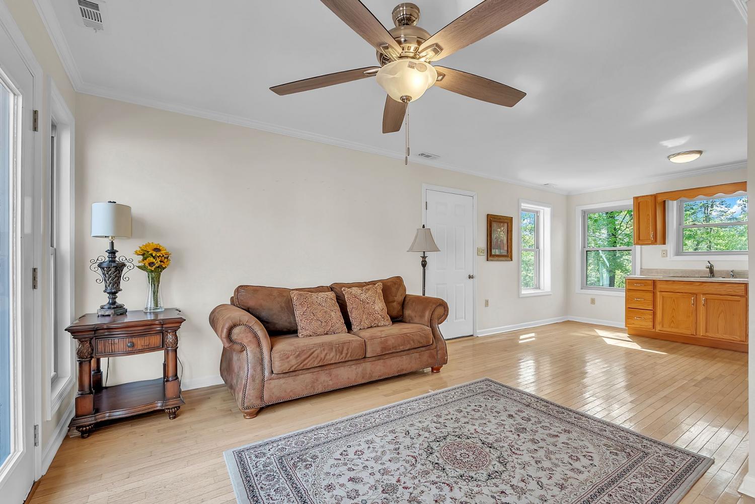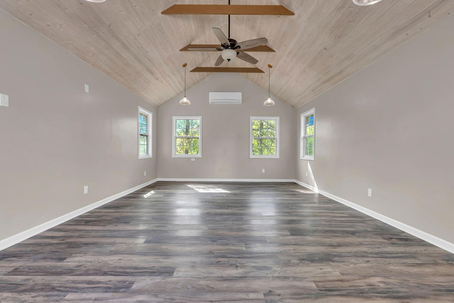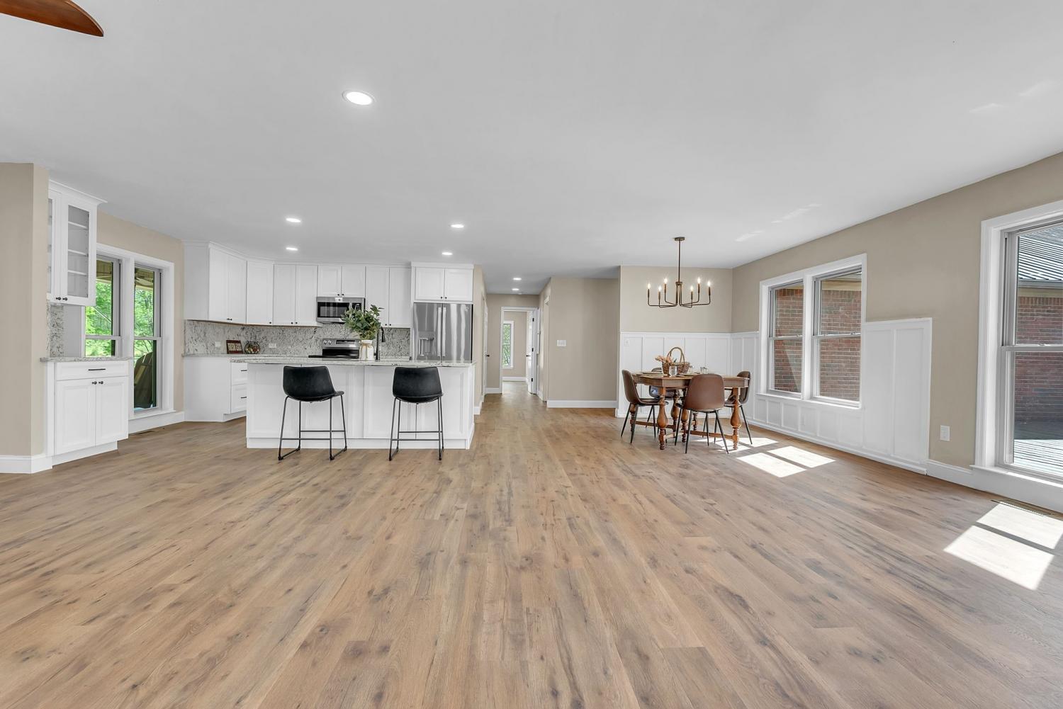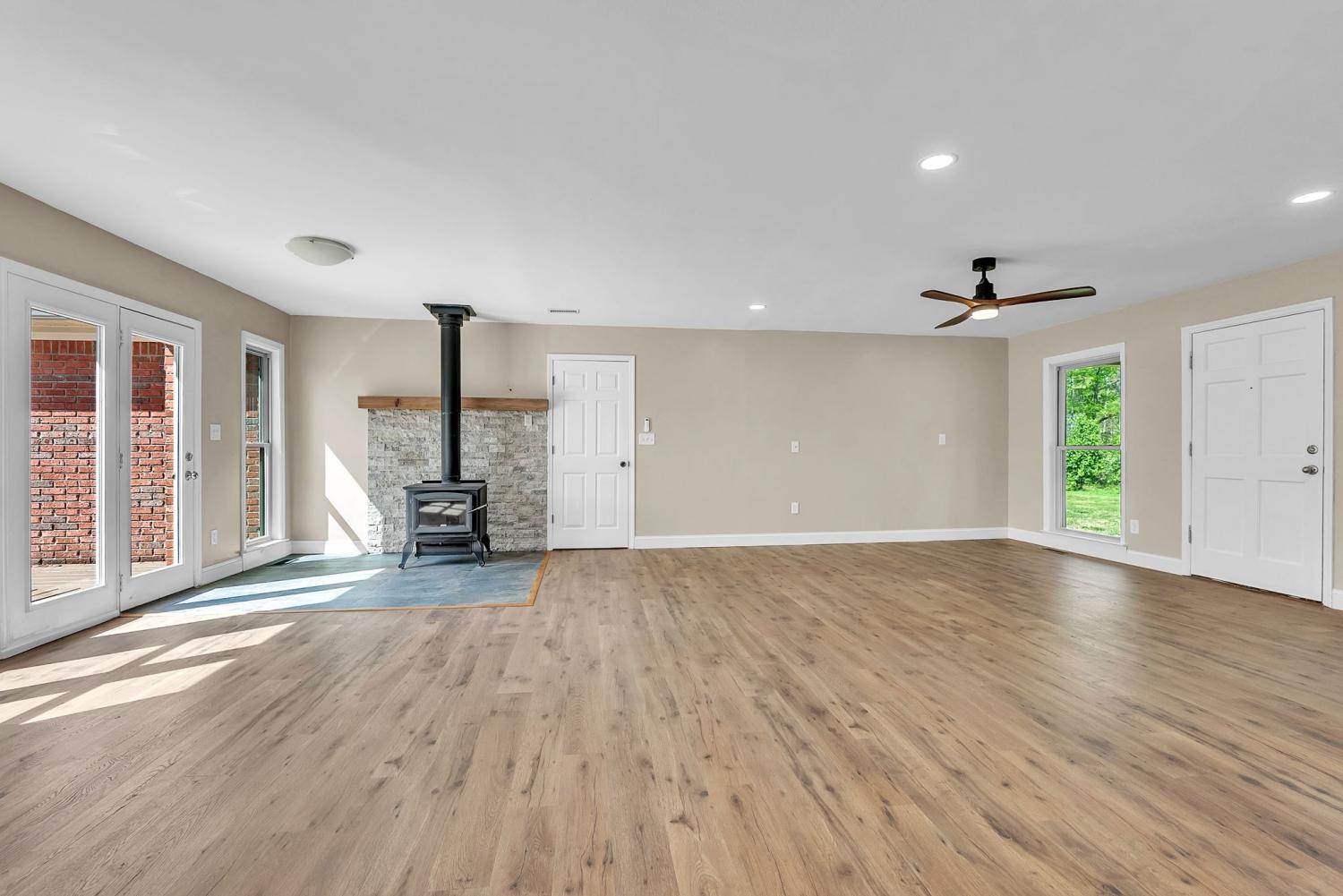 Stunning 5.8-Acre Country Estate with Stocked Pond Fully remodeled private retreat just one mile from I-65! This beautifully maintained 5.8-acre property features a serene ¾-acre stocked pond (15 ft deep) teeming with catfish & bluegill, open pasture, and wooded privacy. A breathtaking entrance lined with 21 mature crepe myrtles bursts with pink, purple, red, and white blooms each season. Wildlife abounds—deer, turkey, ducks, and geese frequent the pond, offering peaceful sunrise and moonrise views from the east-facing home and expansive front porch. The fully remodeled single-level, ranch home boasts a spacious open-concept layout with durable new Pergo wood flooring throughout. The chef’s kitchen shines w/ crisp white shaker cabinets, matte black hardware, “White Ice” granite countertops, a massive 7’6” x 5’1” island seating four, & new GE Profile appliances. It flows seamlessly into the living & dining areas, anchored by a cozy wood-burning stove. A separate pantry/study/office offers built-in granite counters and floating shelves. A luxurious primary suite bath with claw-foot soaking tub, walk-in shower, & double vanity. Two additional bedrooms share a full bath, plus a convenient updated powder room & laundry area. A generous 730 sq ft deck connects the main home to the attached 1,260 sq ft three-car garage with abundant storage. A fully self-contained 680 sqft guest house/mother-in-law suite provides a private bedroom, full bath, eat-in kitchen, living room, & washer/dryer hookups-ideal for extended family or rental income. Additional highlights: 544 sq ft Workshop w/ garage opener. Detached 384 sqft Studio/Office with vaulted beamed ceilings, new mini-split HVAC, & basement storm shelter/storage. 1,152 sq ft Pole Barn with concrete floors, 220amp service, loft storage, lean-to livestock area, workbenches, fenced 2,000 sqft garden, & optional hay production. A rare find offering privacy, convenience, and country charm! Your perfect mini farm.