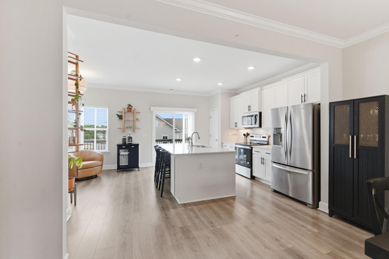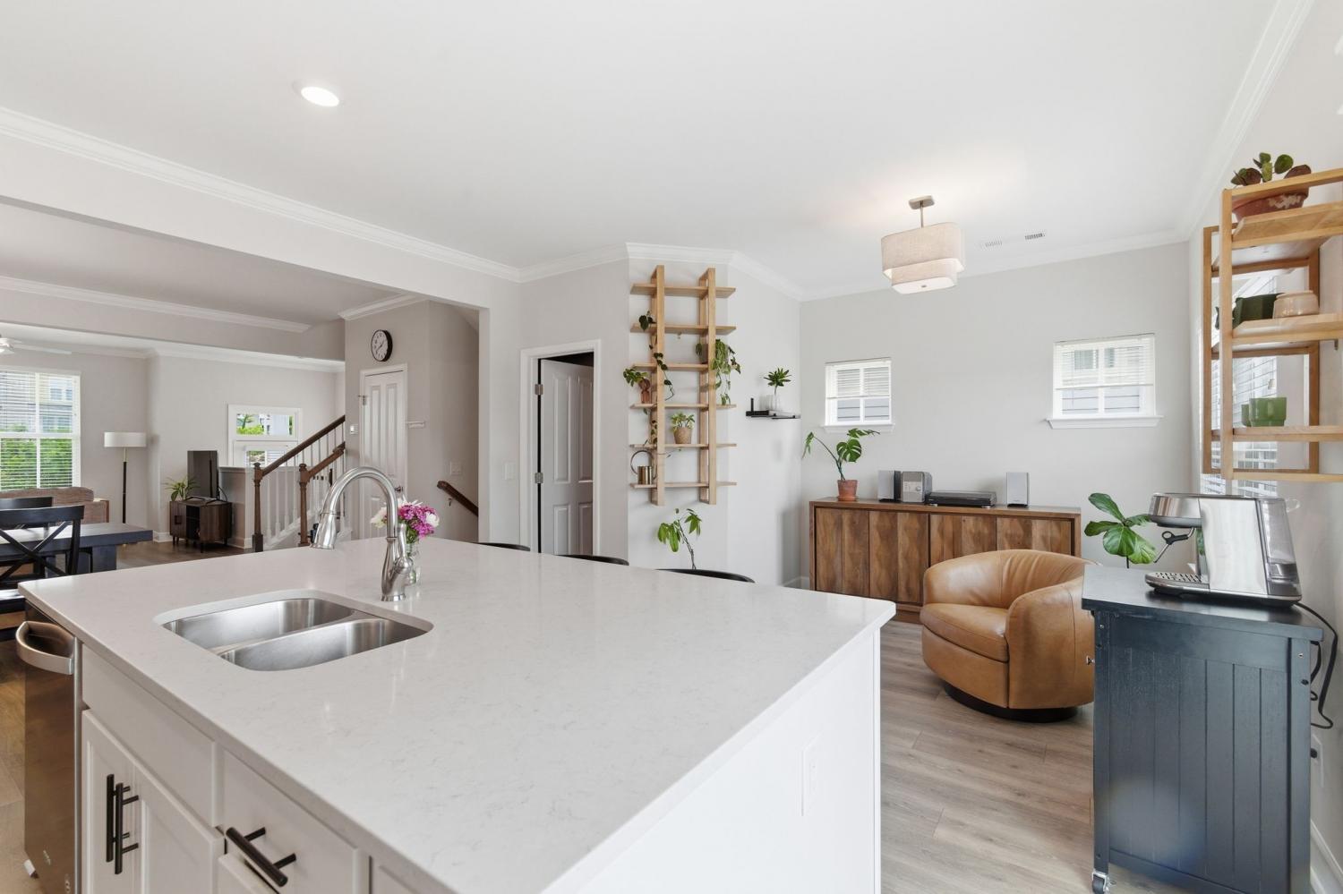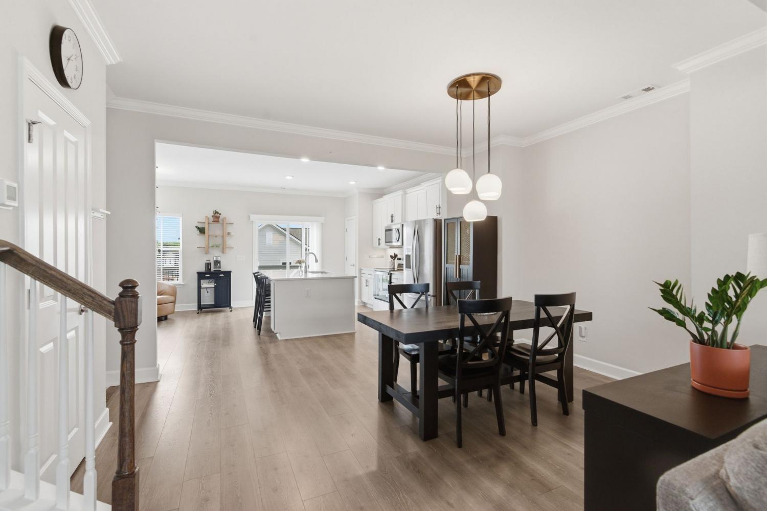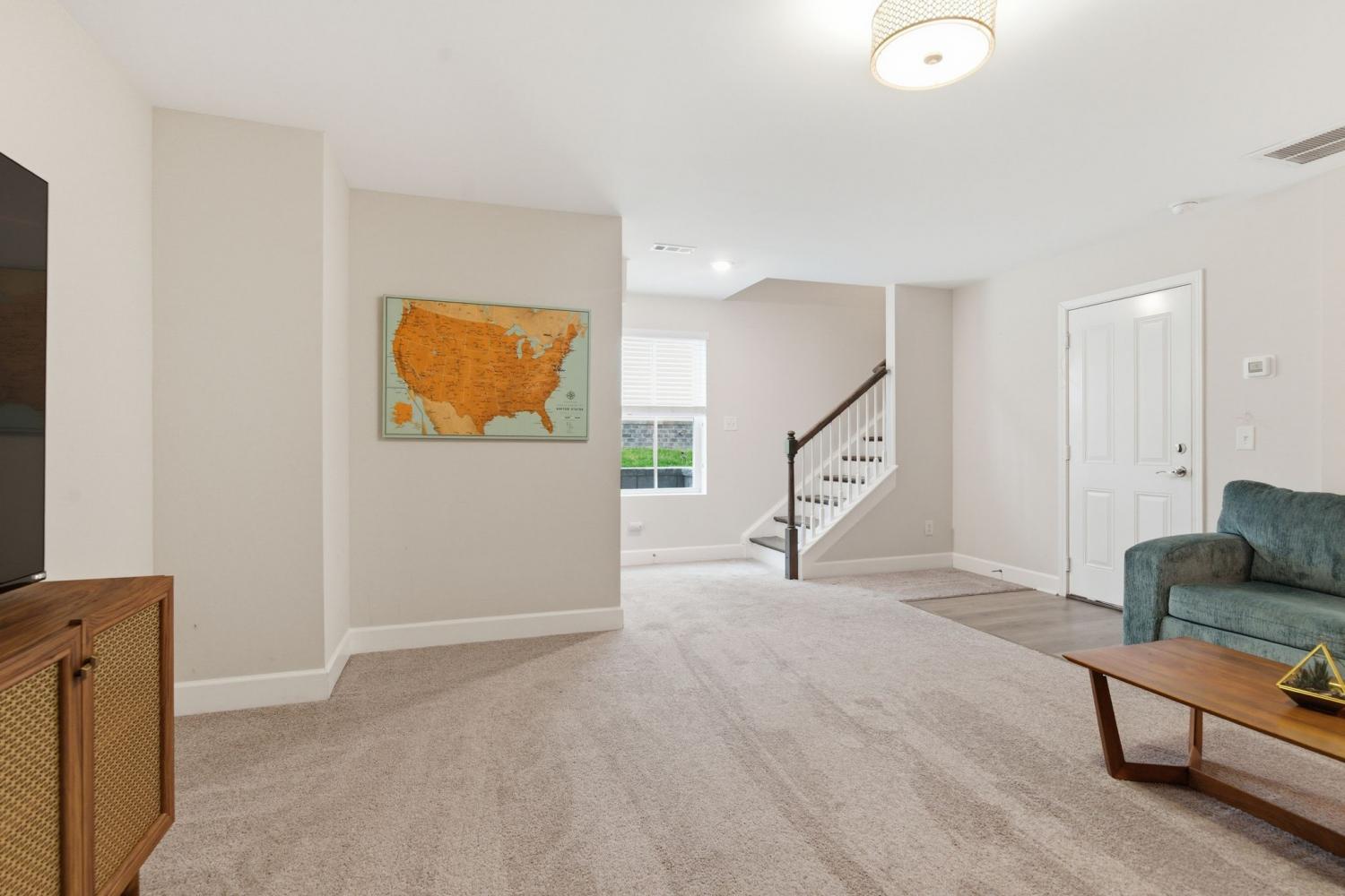 Awesome end-unit townhome in the highly sought-after Carothers Farms community! This move-in ready home offers a spacious, open-concept layout with the living room, dining area, and kitchen seamlessly connected—perfect for both everyday living and entertaining. Durable LVP flooring enhances the main level with style and easy maintenance. The kitchen features beautiful cabinetry, quartz countertops, a large island, and stainless steel appliances—ideal for gatherings. The generous primary suite is a true retreat, complete with a garden tub, tile shower, and two closets. One secondary bedroom includes attractive built-ins, perfect for a home office, guest space, or added storage. The finished basement boasts a large rec room with rough-in plumbing already in place, giving you the option to easily add another bathroom. A spacious two-car garage adds convenience and functionality. Enjoy all that Carothers Farms has to offer, including walking trails, a dog park, community garden, and a charming on-site coffee/bread shop. An incredible opportunity in a fantastic location—don’t miss it! HOA also includes internet!!