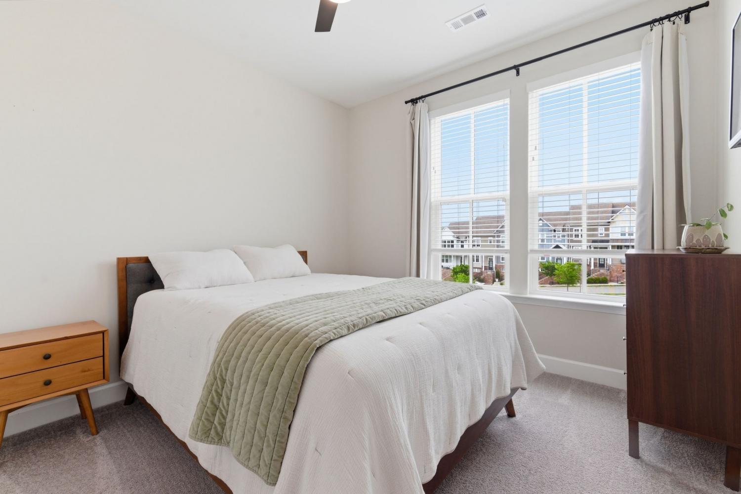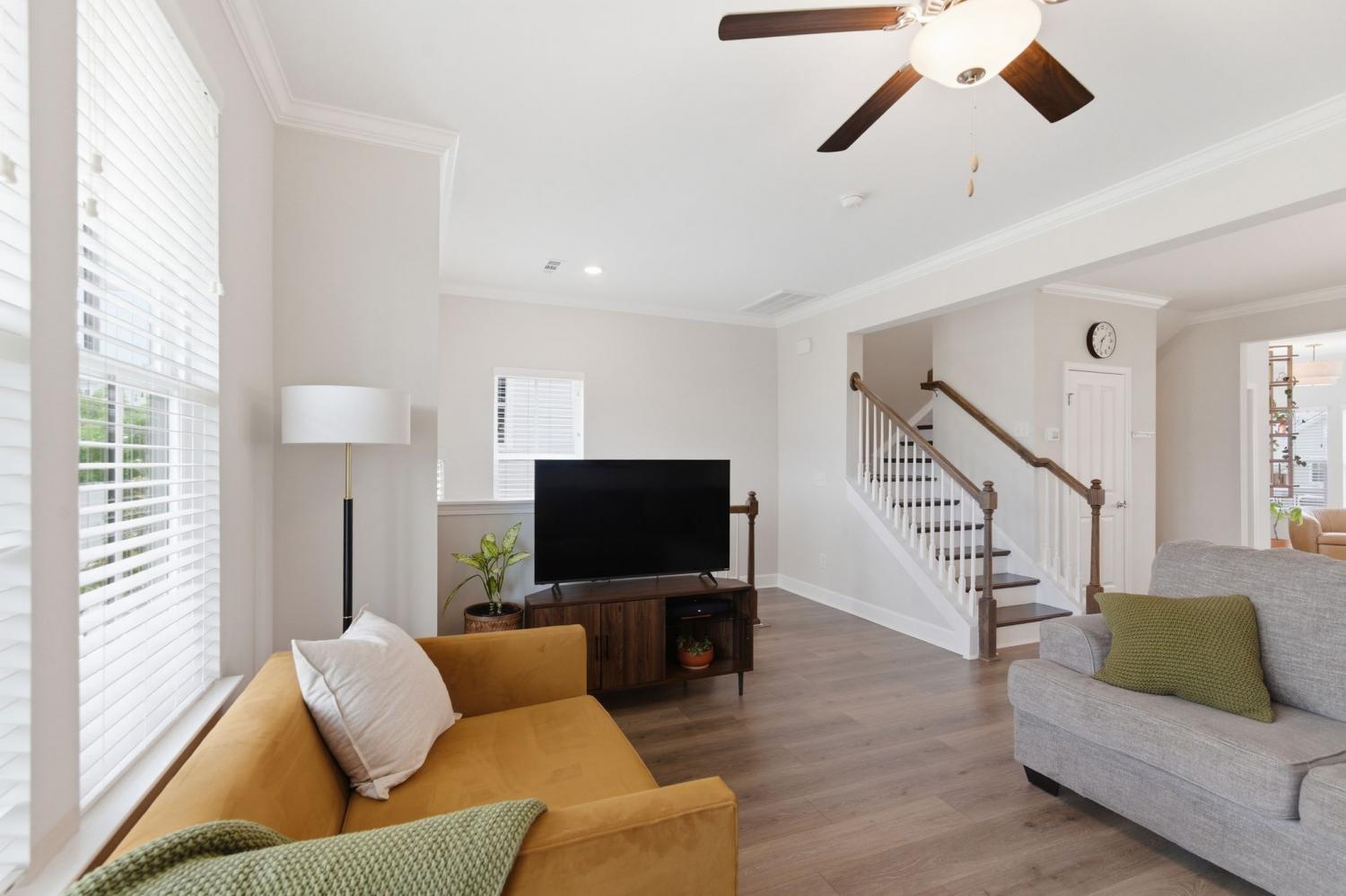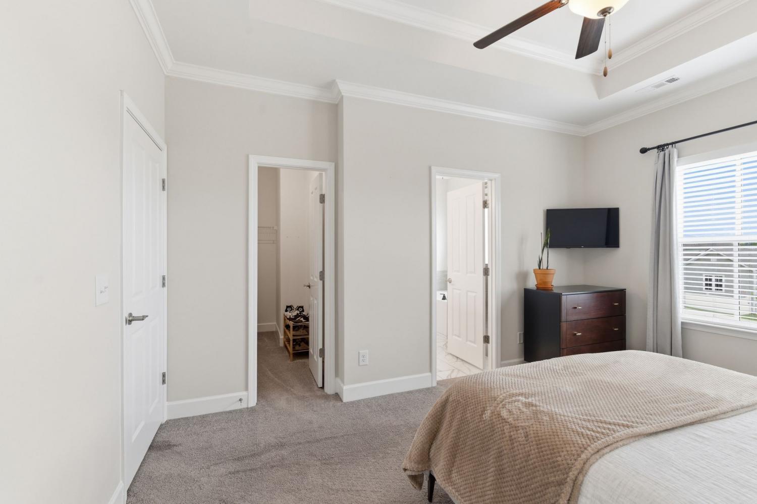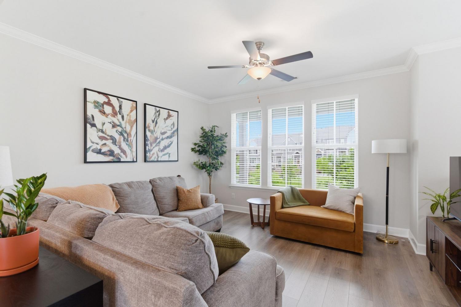 Awesome end-unit townhome in the highly sought-after Carothers Farms community! This move-in ready home offers a spacious, open-concept layout with the living room, dining area, and kitchen seamlessly connected—perfect for both everyday living and entertaining. Durable LVP flooring enhances the main level with style and easy maintenance. The kitchen features beautiful cabinetry, quartz countertops, a large island, and stainless steel appliances—ideal for gatherings. The generous primary suite is a true retreat, complete with a garden tub, tile shower, and two closets. One secondary bedroom includes attractive built-ins, perfect for a home office, guest space, or added storage. The finished basement boasts a large rec room with rough-in plumbing already in place, giving you the option to easily add another bathroom. A spacious two-car garage adds convenience and functionality. Enjoy all that Carothers Farms has to offer, including walking trails, a dog park, community garden, and a charming on-site coffee/bread shop. An incredible opportunity in a fantastic location—don’t miss it! HOA also includes internet!!
