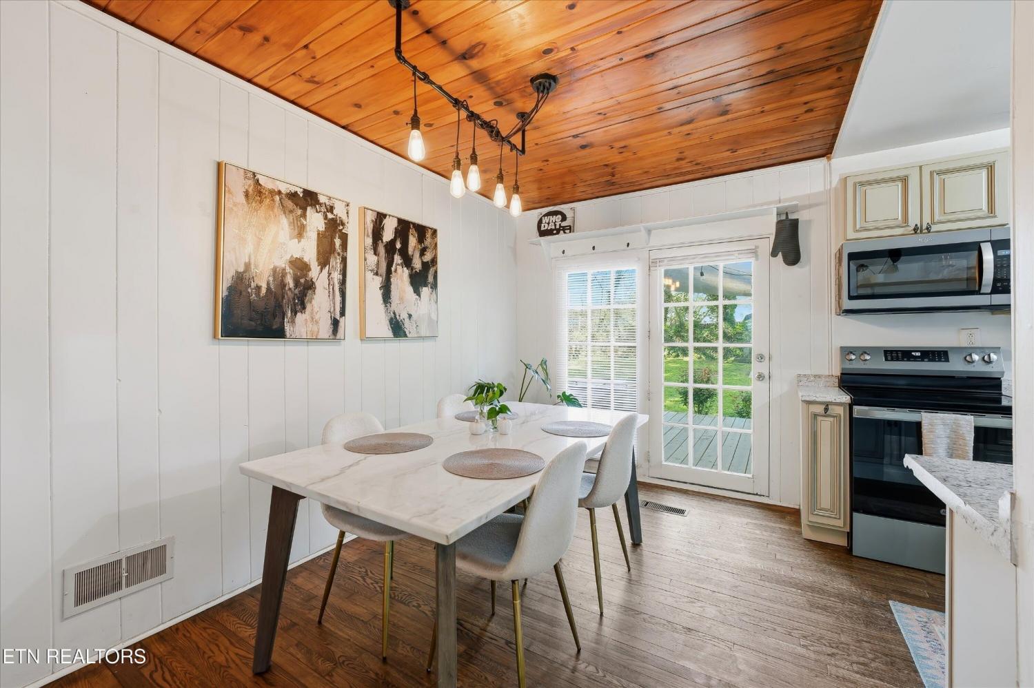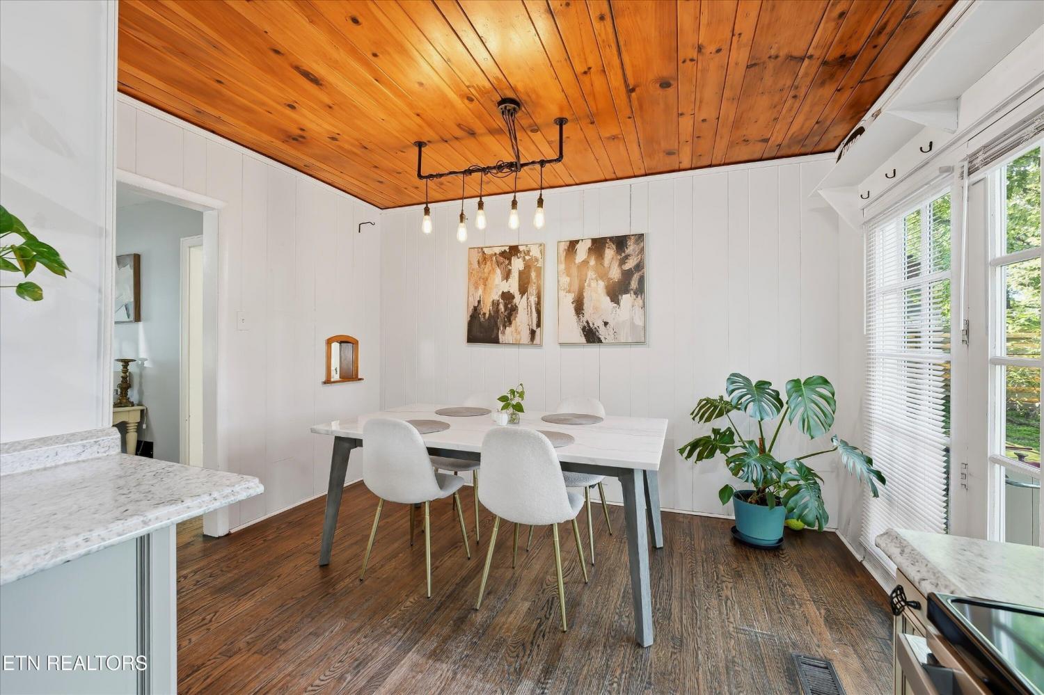 Whether you are looking for timeless charm or modern flair, this captivating home delivers on every front. The main level welcomes you with stunning hardwood floors and a rich sense of character, anchored by a cozy living room with a classic wood-burning fireplace. The heart of the home is the beautifully updated kitchen, boasting stainless steel appliances, expansive counter space, and bespoke open shelving that offers a clean, airy aesthetic. Adjacent to the kitchen, the dining area serves as a true showstopper with its gorgeous, architectural wood ceiling. For added convenience, a dedicated laundry room provides ample extra storage to keep the home organized and efficient. The living space extends upward to a finished half-story loft, a versatile retreat featuring a private half-bath that is perfect for a home office or guest suite. Below, a full unfinished basement offers a massive footprint of potential for future expansion. The outdoor amenities are equally impressive, featuring a walk-out deck/patio that lead into a large, fenced backyard. The centerpiece of the grounds is a spectacular detached workshop, designed with floor-to-ceiling glass windows on the front, and doors that flood the space with light--an ideal sanctuary for a ''she-shed,'' creative workshop, or garden retreat.